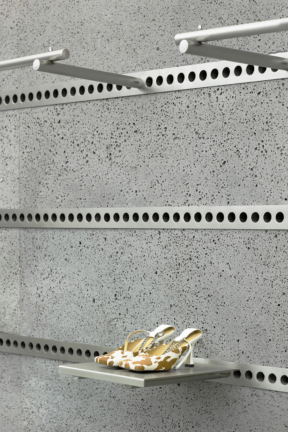 The suit display is hidden in a wardrobe on the wall and opened by kick-back system.It creates a surprise like people opening mystery boxes, and also gives consumers a bit more fun to “hunt” new cloths. The twigs have inspired the design of cloths hanger. The perforated mental modular components is inserted into volcanic stone on the wall, which meet the needs of display variability. Automatically rotating waist twisters are also used in space as display props.