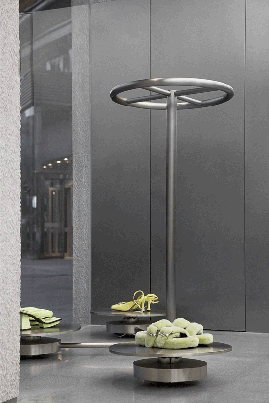 被藏起来的套装,通过墙面按压式的隐形高柜打开。制造了开魔力盲盒的惊喜感,也让消费者多了几分在空间里寻觅的趣味。丛林中的小树枝,带来了衣架设计的灵感。洞石穿孔的模块组件,满足了陈列可变化性的 需求。自动旋转的扭腰器也被运用在空间里作为陈列道具。