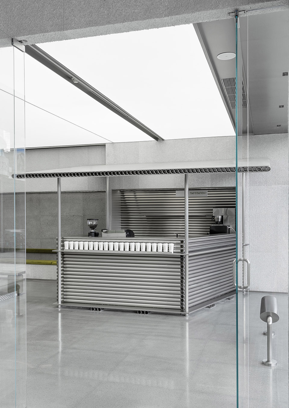 The tap station is a pavilion-like space with an independent structure that provides coffee and drinks.The designer applied stainless steel pipes and metal plates to support and build the whole structure, and the sloped roof makes its independent structure more complete.