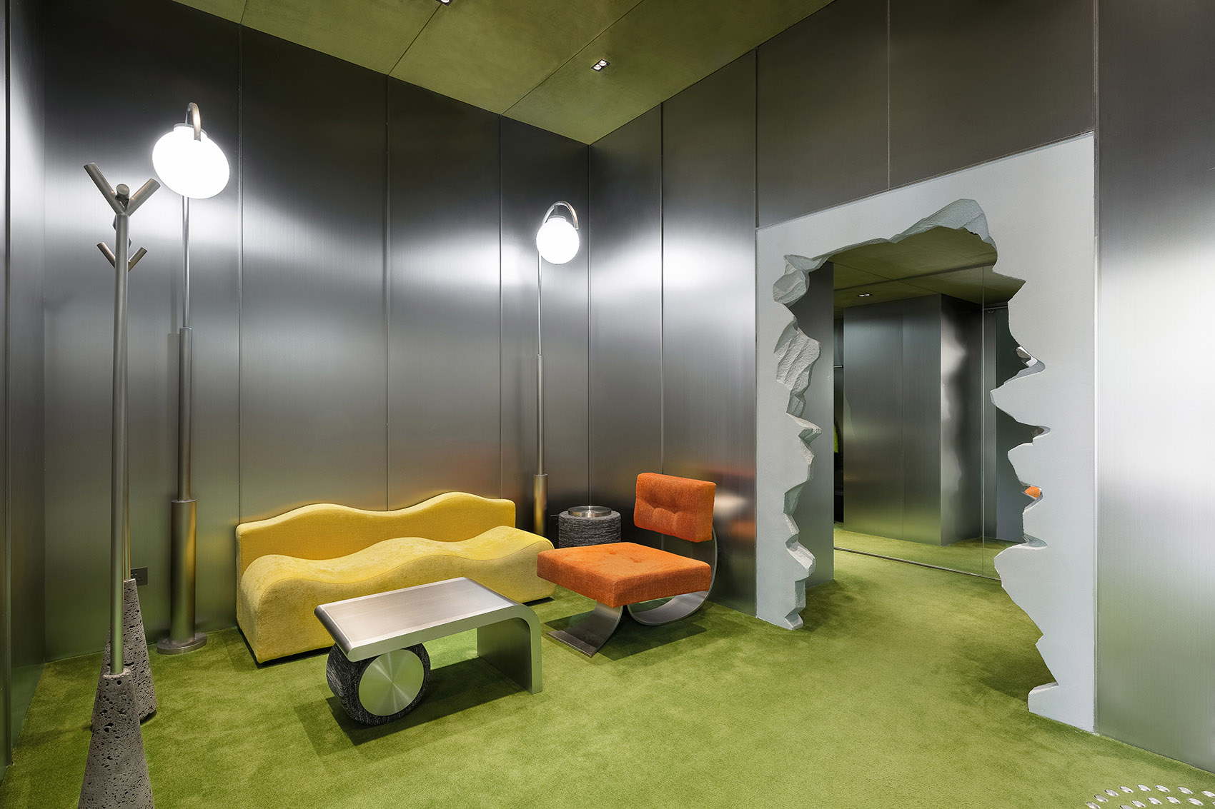 作为理型专家服务的区域,大犬延续日常的、公共性的设计语言,借用街道出现的凸面镜, 创造出五个看似放大镜的奇幻领地。消费者将在此完成搭配问询,测肤,沟通,量体,试穿 等一系列的专业「穿搭」服务。VIP 室的设置提供了更为隐私化交流的空间。