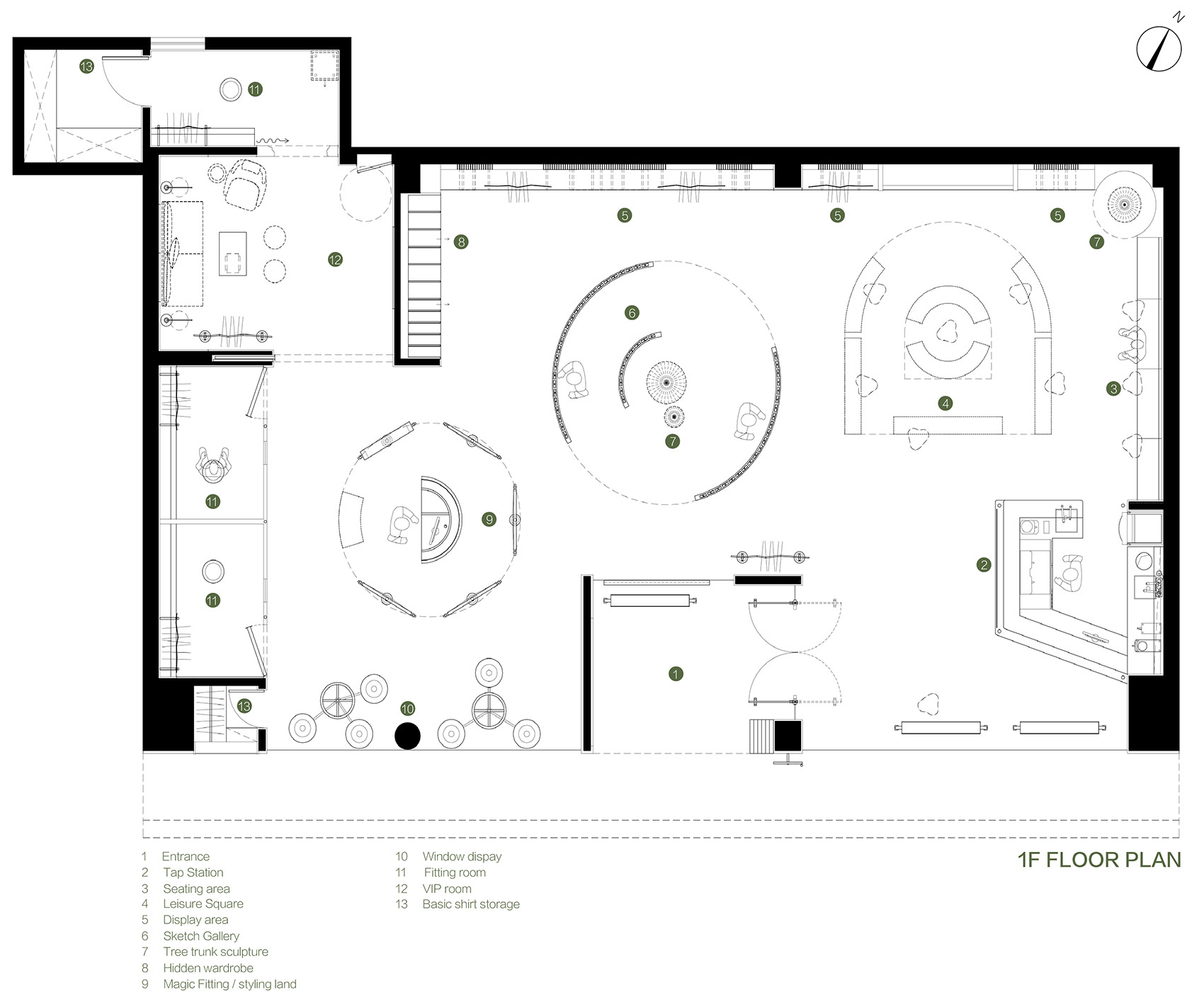 The “Styling” journey begins with a hunting map at the entrance hall, which is curved visiting routes and spatial function zoning . It includes: Tap Station, Leisure Square, Sketch Gallery, Magic Fitting area, Display area, and VIP room mainly. The retreating entrance creates a semi outdoor space where available to the public to rest, chat, wait or even killing time… Its multiple functions respond to the needs of urban residents, rather than creating a commercial space with a sense of distance.