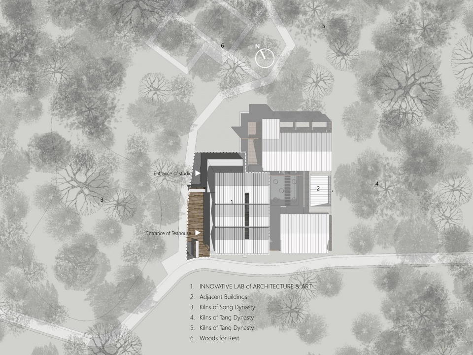 The ” INNOVATIVE LAB of ARCHITECTURE & ART ” was built in Qiongyao Relic Park, a national relic site. From the Han Dynasty, thousands skilled craftsmen gathered here making pottery until the end of the Qing Dynasty. Fourteen kiln sites left behind the history, covered with towering trees, among which people found ceramic fragments of thousand years, proving the engravings of intelligence and labor. Since Qiongyao was a folk kiln, pottery and farming were closely linked in the history of development, shaping special form of geomorphology: the kiln sites were scattered and inserted in the layout of the farm and yards – the trinity of production – Life – farming. The social structure and the spatial geomorphology enhanced each other’s being. One of those yards, now, became the site of the INNOVATIVE LAB of ARCHITECTURE & ART.