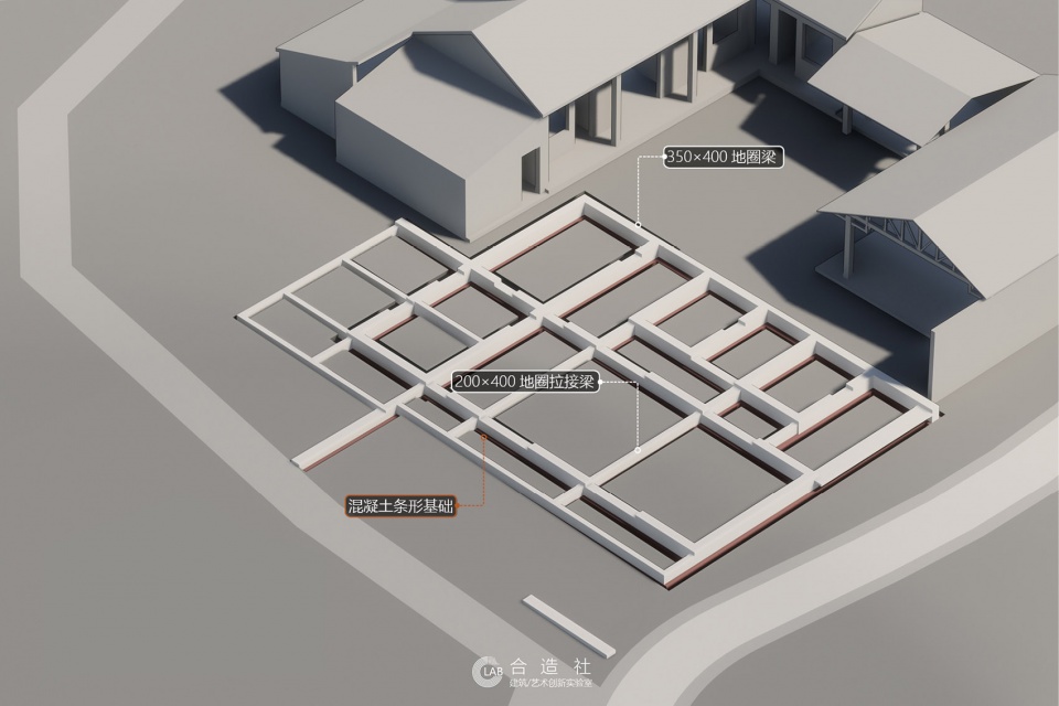 1. 混凝土圈梁不仅起到加强水平抗震性能的作用,还成为夯土结构墙体和屋顶轻钢系统的承接系统发挥作用。钢的材料特性耐碱不耐酸,而混凝土是碱性的,夯土一般是酸性的。夯土和混凝土无缝承接,混凝土和钢无缝承接。