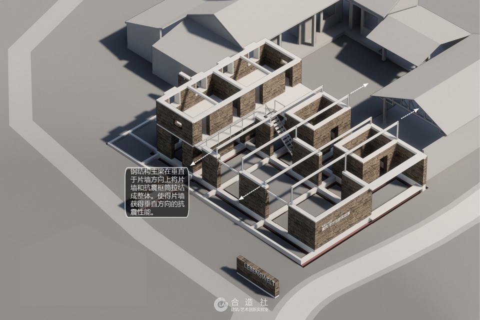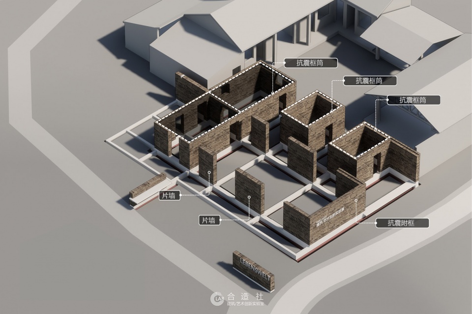 除了材料上的改进,夯土的抗震抗剪性能主要来源于结构平面的合理性。在这个建筑中,大部分的结构构件被设计成为小框筒,抵抗来自任何方向的水平力。而框筒和框筒之间,是作为自由平面的公共空间。大空间处的片墙,被屋顶钢框架和基础地梁与抗剪框筒连接在一起。这个平面可以被视作一类结构原型“框筒抗剪 + 自由平面”,适用于大多数的乡村公共空间的建造。