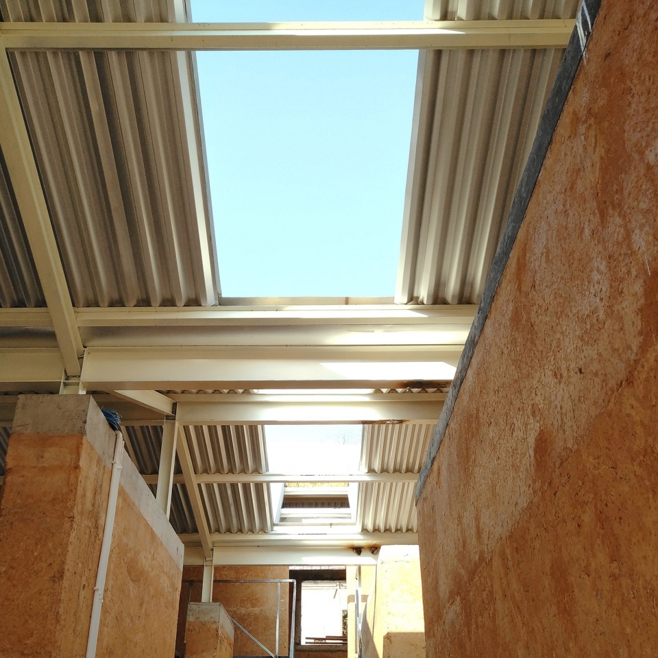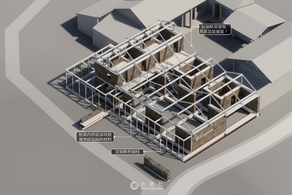边廊系统采用合造社研发的特殊构造断桥钢柱。钢柱既是承重构件,也可以做窗框使用。断桥钢柱间直接卡装中空保温玻璃。边廊屋顶结构采用工字钢作梁,下翼缘安装波纹板,形成盆型空间可填充保温材料。