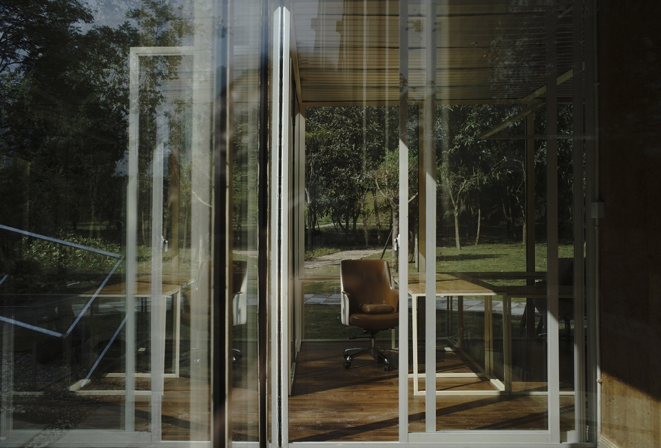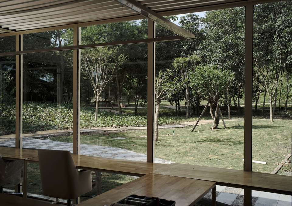 Outside the building are two rammed earth parapets. At the waist of the parapet is a concrete desk, which protects the foundation of the parapets from rain. The other side of the parapet will be exposed to natural sunlight and rain. The earth parapet will slowly decay over time and return to the earth. This process may last for decades: a modern relic is made up.
