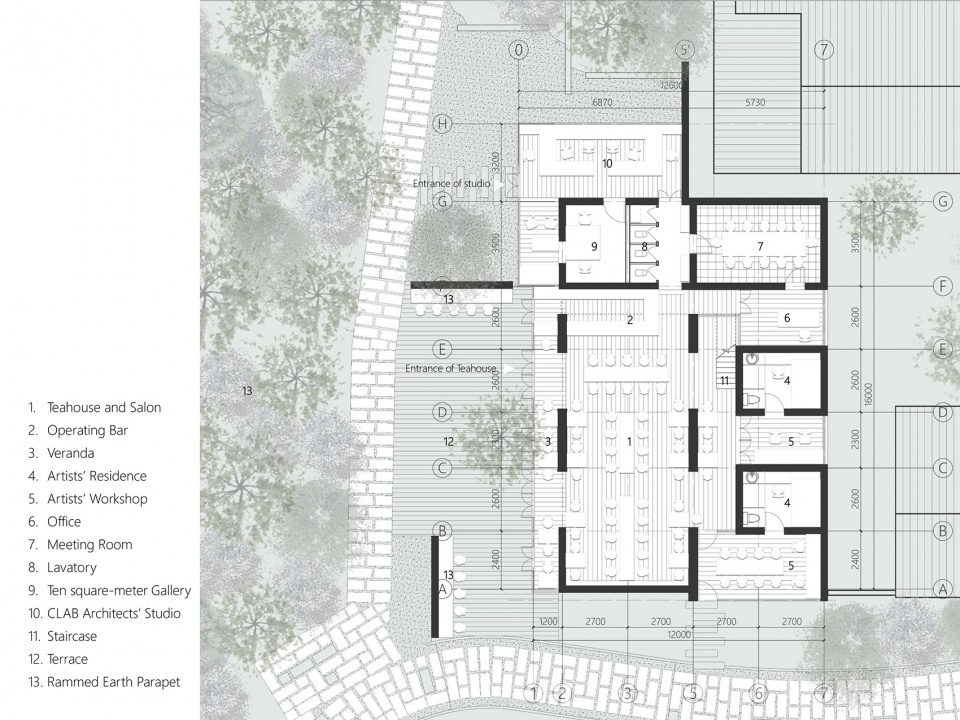 The whole building includes a conceptual teahouse for public activities salon, the residence of architects and artists, and CLAB’s studio. The space is made up of several rammed earth’s cylinder and half cylinder structure. The cylinders itself are residence spaces as they are relatively private, and the between those cylinders is the flowing public area and studios. The work scene of artists or architects is a landscape that the space can provide to the public, which may be the best response and inheritance to the intellect, labor, and creation of a thousand years of craftsmen. As the main public space, a conceptual teahouse tries to practice new agriculture that can be rooted in the rural area. Architects of CLAB cooperate with a creative agriculture people who has been engaging in tea making, working together to run the concept teahouse, hoping to give new experience and meaning to Chinese traditional tea drinking.