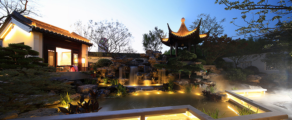 曲径通幽处,别有一番意趣处处藏。亭台楼榭围绕中心水系陈铺,来客游园与主人归家相对独立,功能与意境相得益彰。遥望家家户户的水巷,齐聚护城河,让那河围绕在家家户户里,切实打造了居处的最佳理想,将江南好风光和连绵的情意都承载于园。黛瓦粉墙,飞檐斗拱,精巧细致,厚重轩昂。精致的青玉石与镂空景墙交相呼应,通透灵巧。小桥流水,绿木萦绕,月影觥筹,相映成趣。