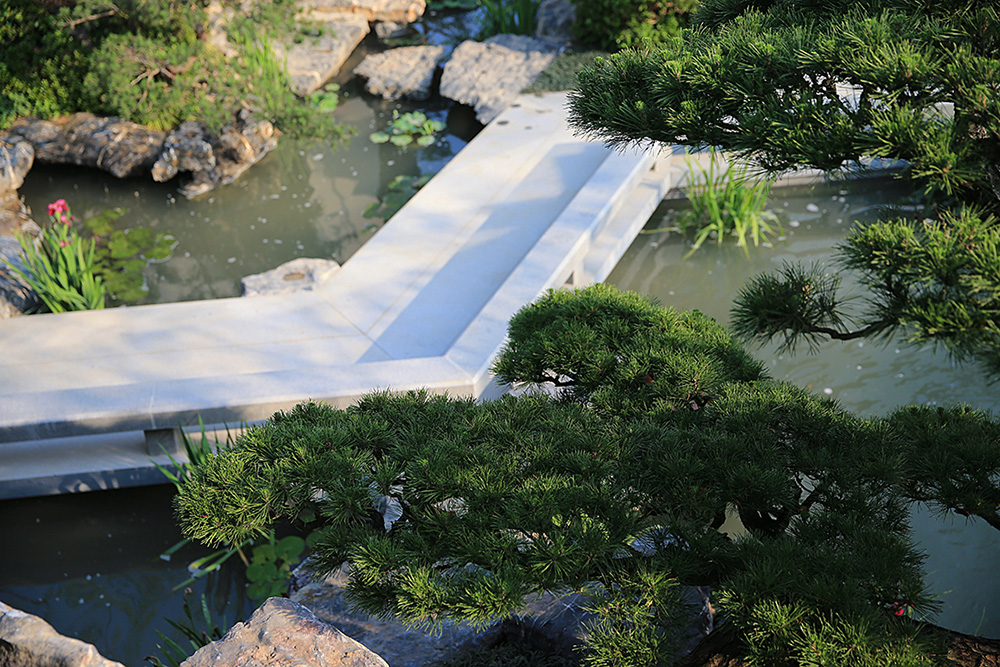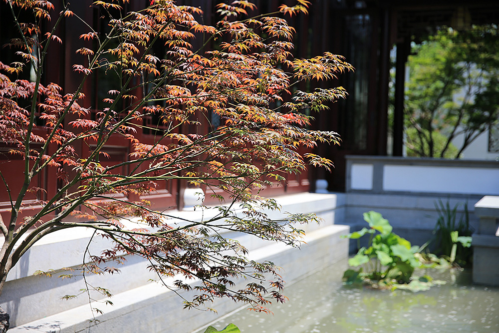 The winding path leads to secluded places. There is a special interest hidden everywhere. The pavilions and pavilions are laid around the central water system. Visitors visiting the garden are relatively independent from their hosts returning home. Their functions and artistic conception complement each other. Looking at the water lanes of every household, the moat gathers together, and the river surrounds every household, effectively creating the best ideal of residence, and carrying the good scenery and continuous affection of the south of the Yangtze River in the garden. The black tile pink wall and cornices and arches are exquisite, thick and dignified. The exquisite sapphire and the hollowed out landscape wall echo each other, transparent and smart. Small bridges and flowing water, green trees lingering, and the moon's shadow drinking water form an interesting contrast.