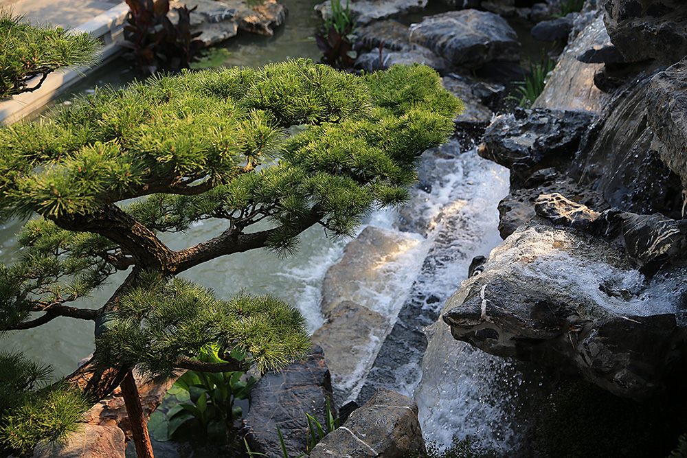 The landscape of the sales office is based on mountains and waters, accounting for nearly 50% of the total area. The water system starts from the rockery on the north side of the sales office, meandering through the old room teahouse and finally to the vestibule corridor. Surrounded by a stone stream bank, it is half enclosed. You can see the water from all sides and see the mountains everywhere