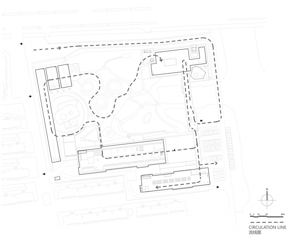 The development of cities has surrounded this land. In order to create an immersive historical atmosphere for tourists, the museum adopts an encircled planning. Buildings and the boulevard isolate noise, and the circuitous colonnade connects scattered buildings forming a centripetal space that echoes the introverted space of a traditional Chinese garden and maximizes the area of the protection section.