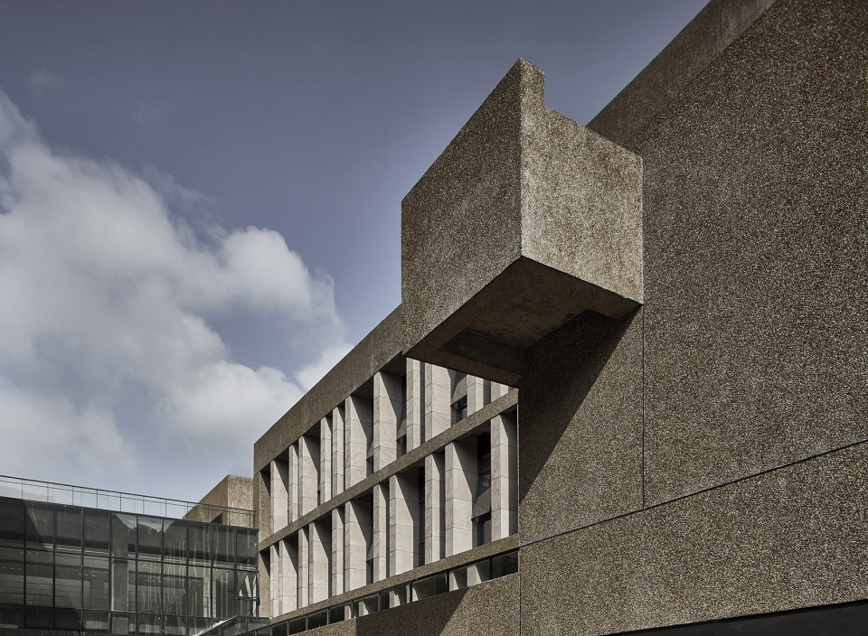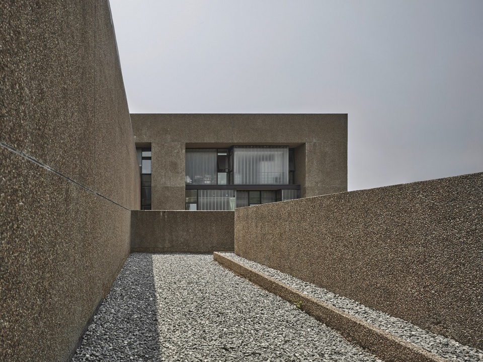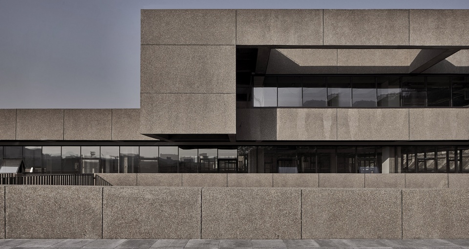 ▼水刷石立面显现出一种浓烈的暖调,强化了建筑的棱角和体块,the sandstone facade presents a strong warm tone, repeatedly emphasises the building’s corners and body blocks
