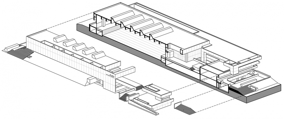 The idea of the landscape is implied in the concept of cluster integration. Buildings, mountains and the Earth are embedded into each other. A blurred demarcation of architecture and landscape formed a brutal aesthetic significance. Take the swimming pool as an example: the form drift along the topography at the junction of the foothills of Tianma mountain and a flat ground. The main entrance stacks like rock pieces on the mountain, along with the use of large-scale outdoor steps, clarifying its relationship with surrounding landscape and guiding people in, while also providing a platform to accommodate a variety of public activities. The main venue, a floating mass, which became the centre of the entity, is like a highlighted box standing out from the mountain, forming a contrast and integration with the surrounding, fully expressed the passion and tension of sports building.