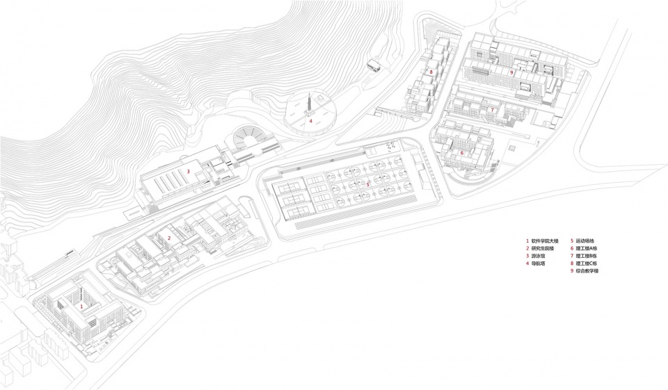 设计整体引入群构的思想,按照学科属性进行组织,建构出相应的秩序和逻辑,保证了功能使用的高效和便捷,如将物理楼、微电楼和数学楼整合为一个群组。与此同时,在大的分区原则下,设计也注重不同学科的交流融合,如将艺术设计学院和软件学院置入到一栋楼内,以期产生跨学科思想碰撞的灵感火花。