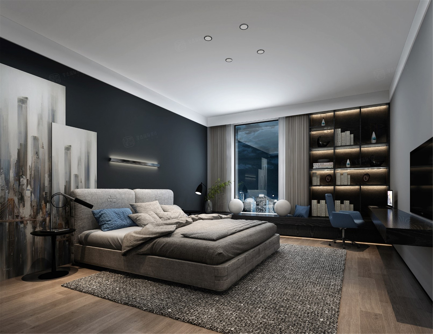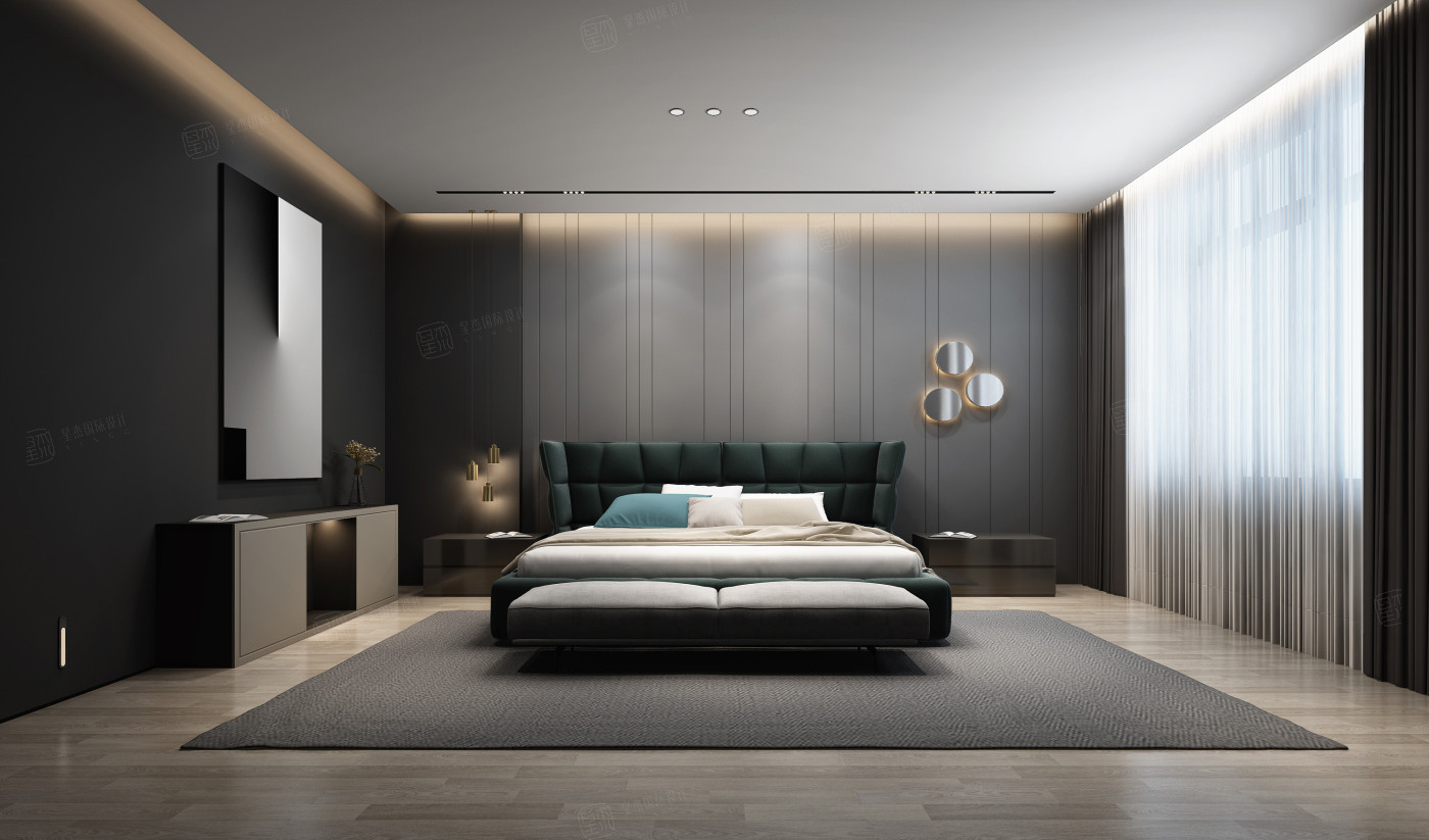 The master bedroom is in modern style, and the light fixtures are comfortable and warm, combined with simple wood veneer and hard bag.