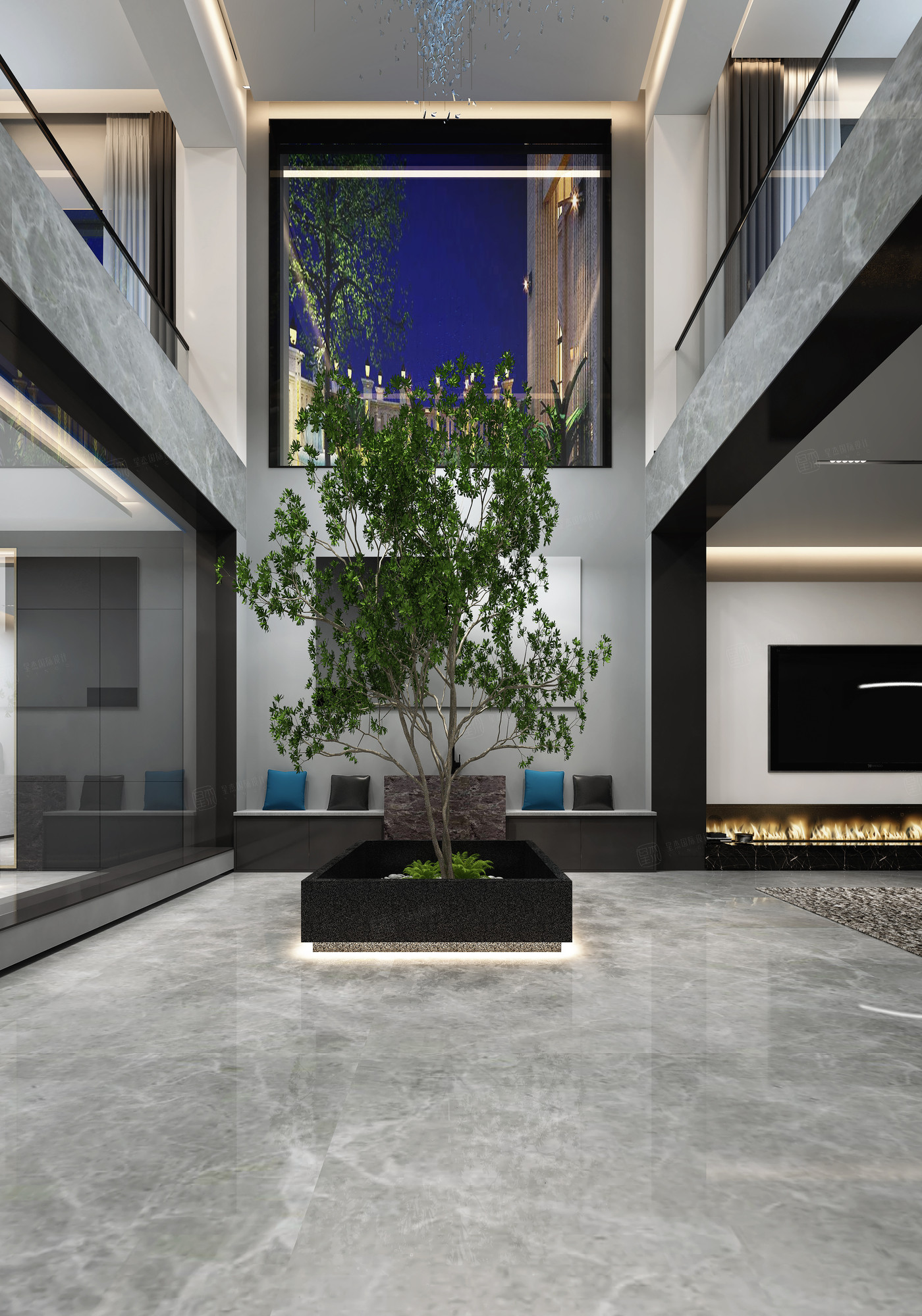 地下室全部打开,引进大量的阳光和绿色植物,注重材质与材质之间的搭配和细节处理,色调以轻盈的黑白灰色为主调,搭配软装调色。