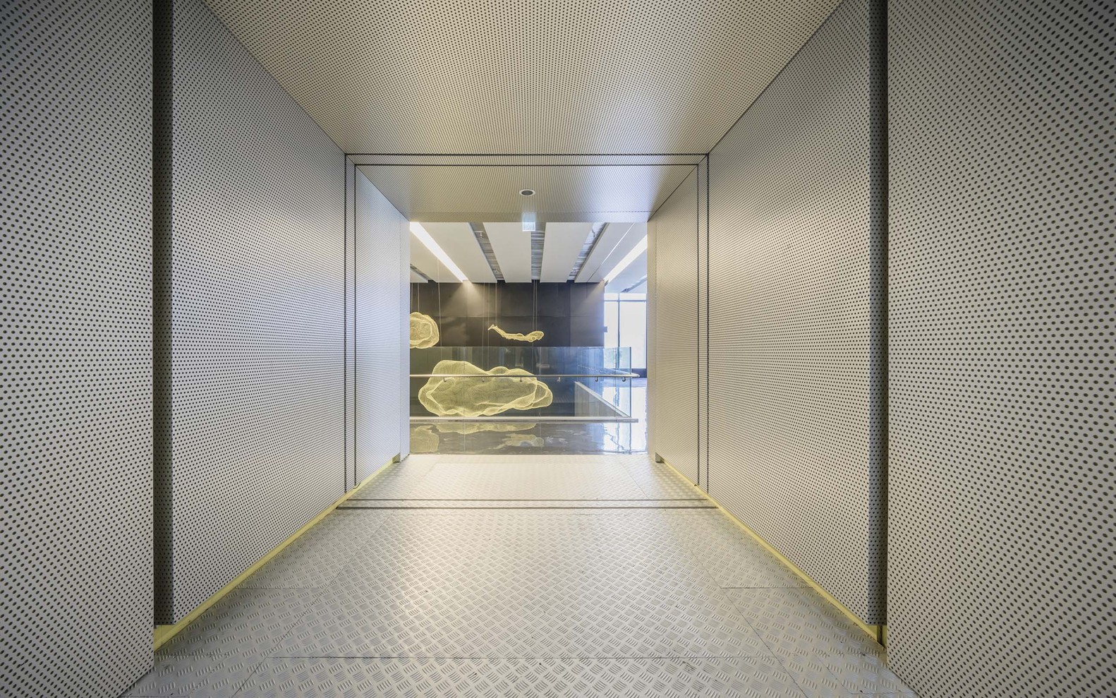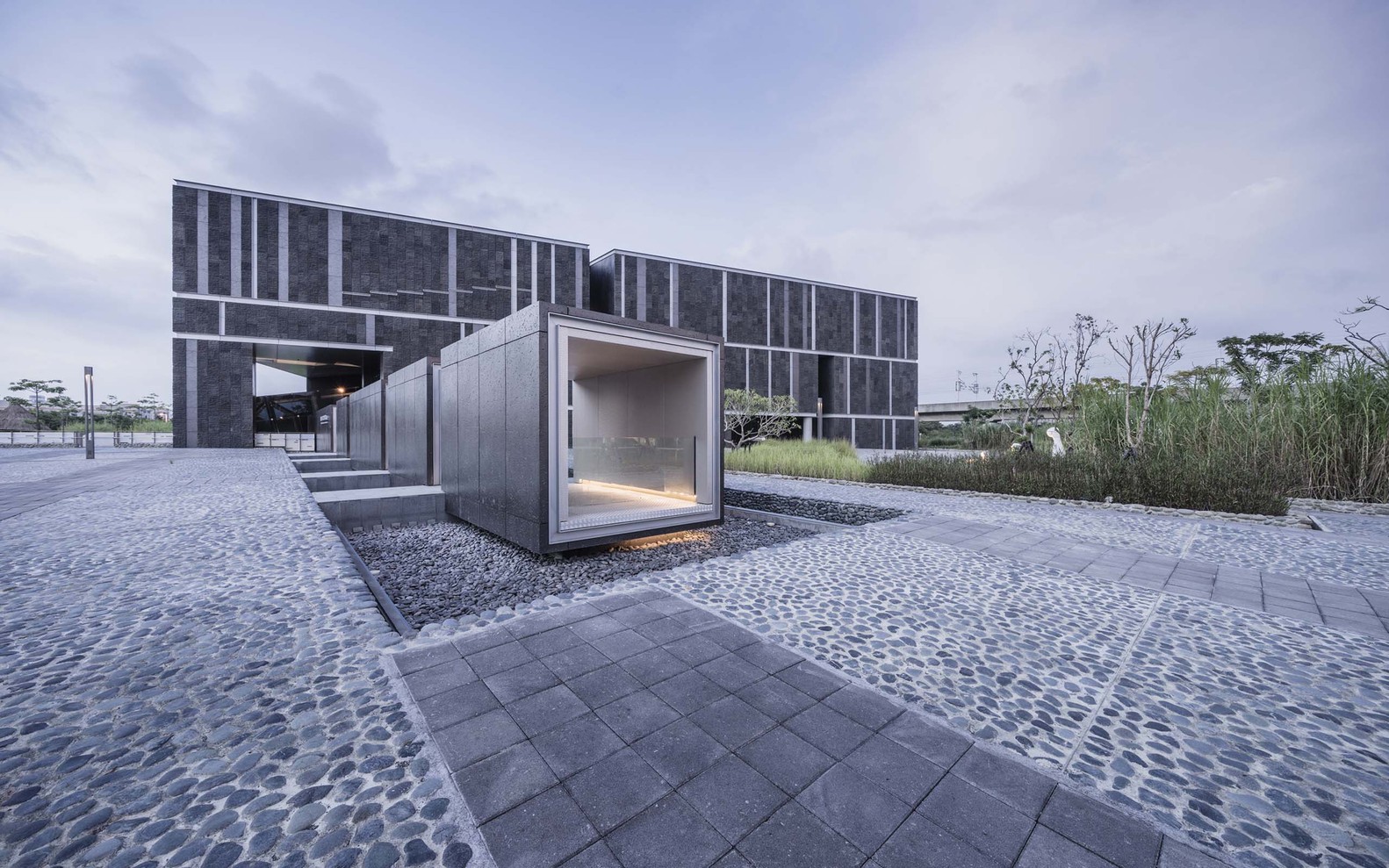 本基地紧临高速铁路轨道,平均每几分钟即有一辆高铁列车会经过,过程中约3.5秒会与本基地比肩相邻。巧妙地运用乘客的高铁体验,透过动线的设计让访客先穿越方形的玻璃通道,在频繁经过的高铁车次中,让每个访客都能穿梭「现代」,眺望这趟最新、最快的交通技术和科技园区设施,仿佛正在见证未来。