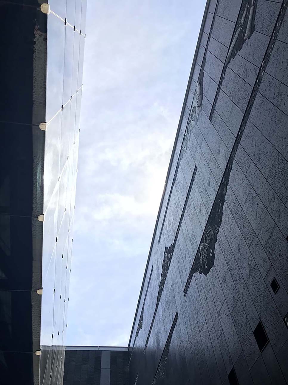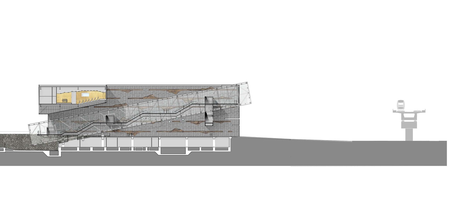 建筑以两组不同几何向度组成:一轴线指向近正北,与古代埋葬的方位吻合,代表过去的秩序;另一轴线遵循现有都市街道纹理,与主要轴线交错19度,代表现有的秩序。