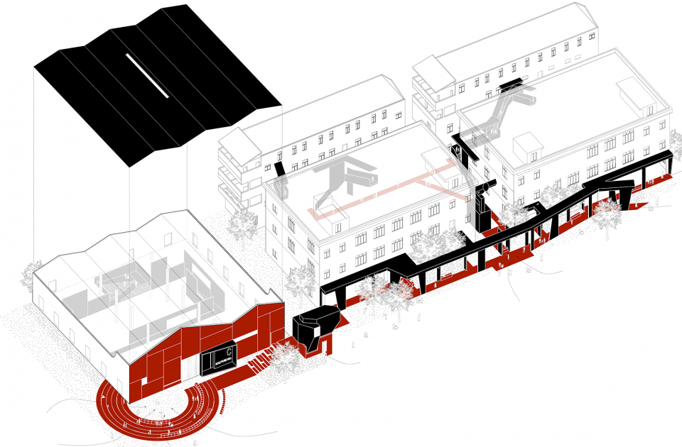 Responding to the clear demarcation between the old factories and residential buildings respectively scattered on the north and south sides of the main road, the architect proposed to create a main axis of public spaces in the center of the culture district given a fairly limited renovation budget. This design intervention seeks to provoke dialogues between buildings of diverse materials and scales through strategic and visual reconnection. An elongated pavilion made of red brick and black steel stretches across the entrances to three exhibition halls, and forms a continuous public corridor. The original roadside parking area was rearranged to the west side of the district, transforming the main street into a major public space for pedestrian activities. The corridor system also extends from the main street to the back street to provide guidance for the public to explore more while offering necessary evacuation passages for the old factory spaces. The renovation adopts a low-interference strategy which not only ensures the integrity of original building structures, but also allows the historical traces, such as the vibrant climbing vines and graffiti on the walls, to be preserved as much as possible.