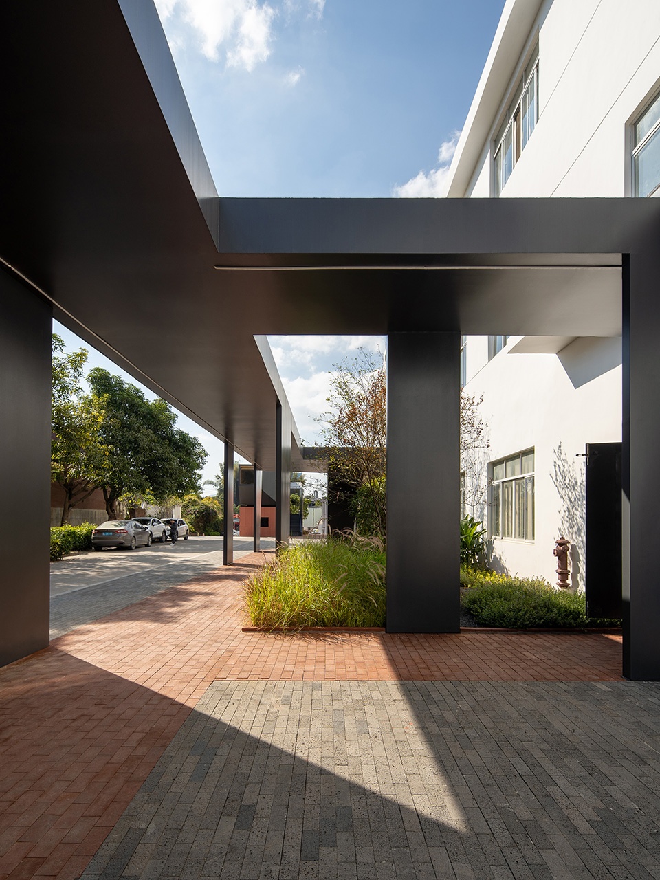 Shenzhen Pingshan Sculptural Art & Creative Park is located in an old industrial district with abandoned factories at the foot of Maluan Mountain, Pingshan District, Shenzhen. Covering an area of 30,000 square meters, this transforming culture park has become the new home for a number of creative studios and artists specializing in especially sculpture, painting, and calligraphy since the 2010s. In 2019, the architect was invited by Mr. Liu Xiaodu, the director of Pingshan Art Museum and Eastern Shenzhen Cultural Development Company, to renovate the public spaces of the park. After examining the site, it was clear to them that the park consisted of two distinct sets of spatial materiality that speak to the complex urban memories and the city’s temporality. The northern part is composed of old factories with relatively large volumes that are mostly coated with white stucco, and decorated with black metal doors and window frames. While the southern area is constructed from a series of small-scale red brick houses and brick-paved steps hidden in the shade of trees.