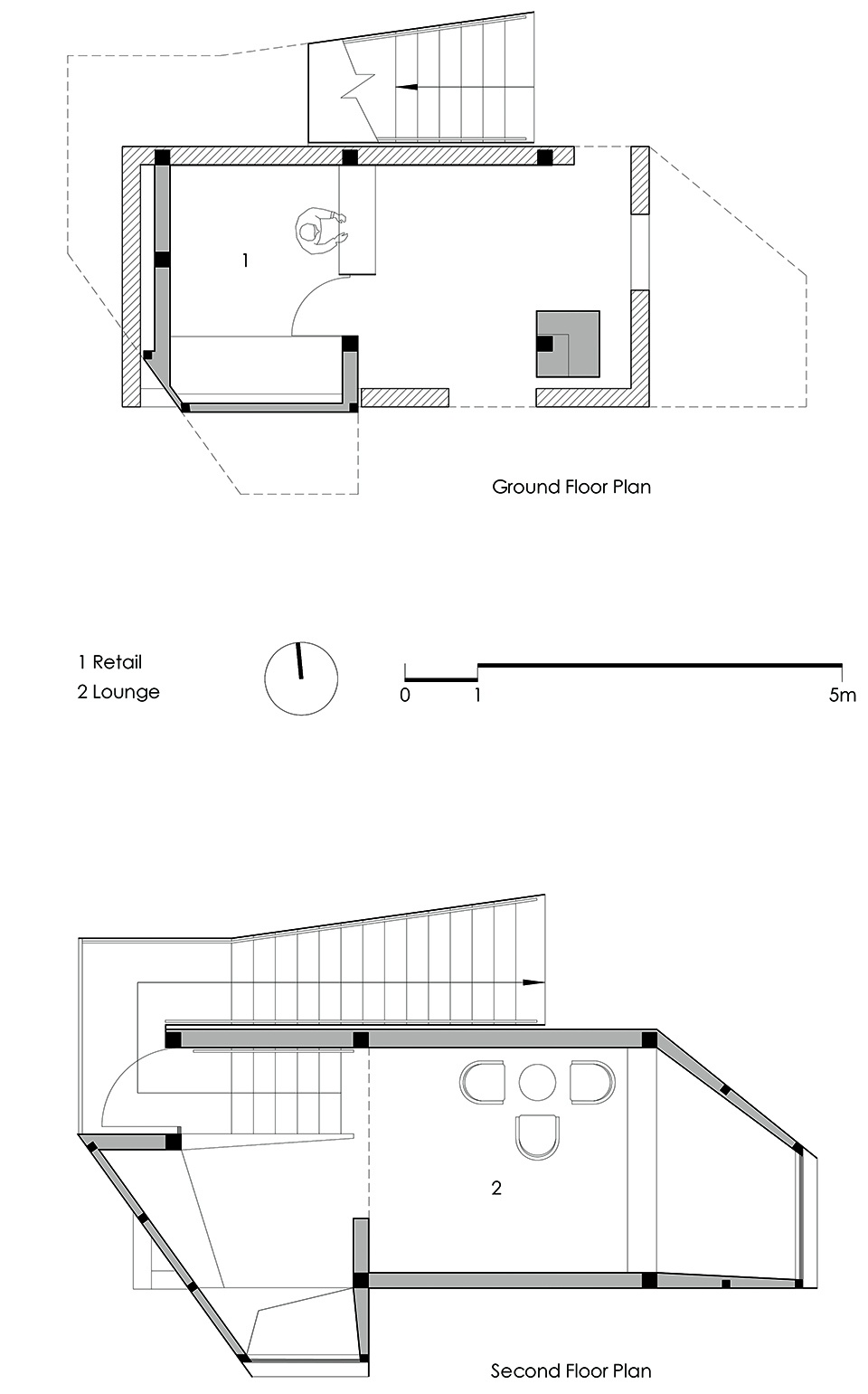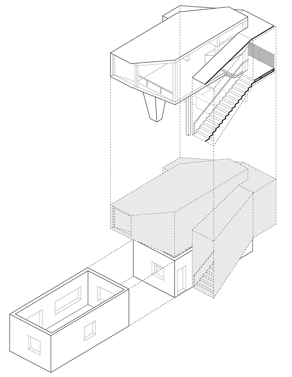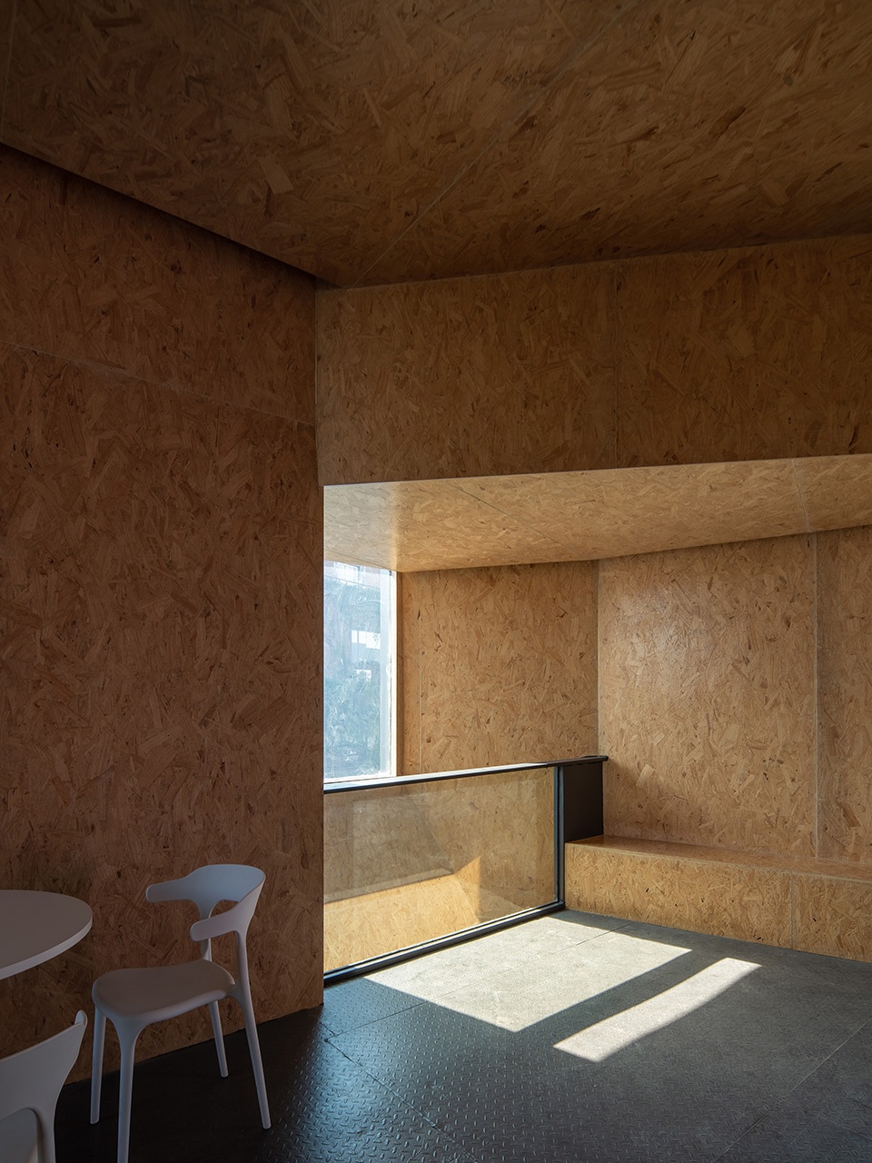 The existing skeleton of the security guardhouse, being its walls, door, and window openings, is now preserved and clad in red cement fiberboards. The art space on the second floor is built as an independent steel structure grown out of the original guardhouse with a 10cm vertical gap reserved between the new structure above and the old wall below, allowing light to transmit in between the past and the present.