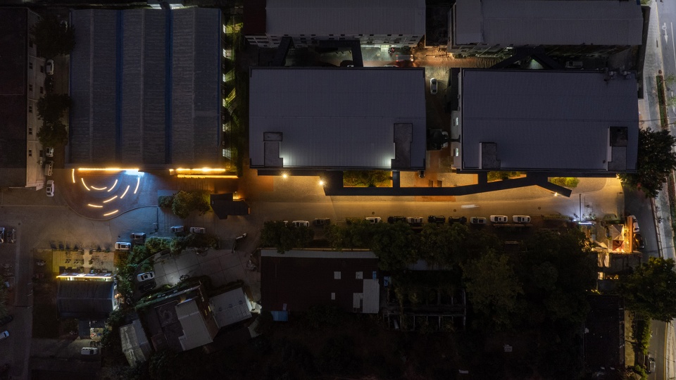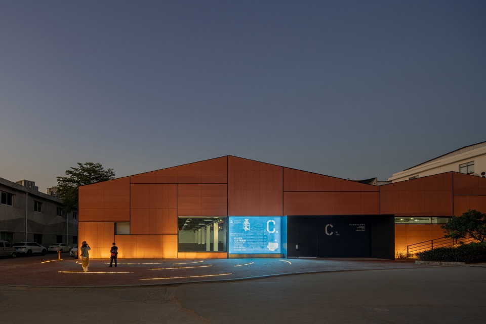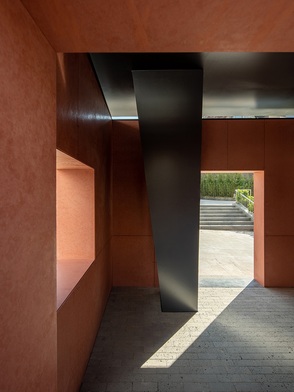 The facade renovation of the main exhibition hall continues the narrative of the nesting relationship of red and black. It echoes the original sloping gable roof of this factory building and the contour of mountains nearby, forming a geometric hilltop with an abstract composition.