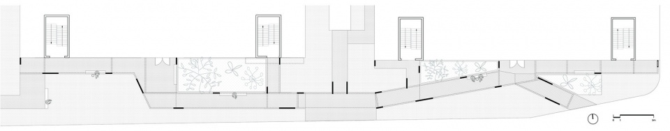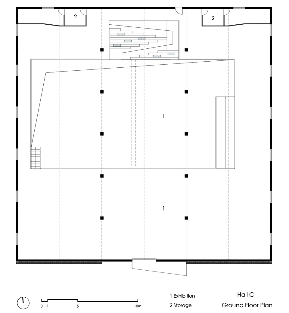 The main exhibition hall has an interior space of 1,000 square meters, but the height clearance was only 3 meters below the trusses in its original state, which was significantly insufficient for the needs of contemporary art exhibitions. Given tight construction budget, the architect discussed with the museum curators and the contractors on several options. As a result, the original proposal to lift the entire roof of trusses was modified into digging down 1.5 meters for a proper ceiling height with minimal cost. When the pavilion complex was completed in September 2021, it served as the Pingshan sub-venue as part of the 17th Shenzhen Cultural Expo, and accommodated more than 20 contemporary artists’ sculpture artworks. Many large pieces were installed successfully in the sunken area inside the exhibition hall.