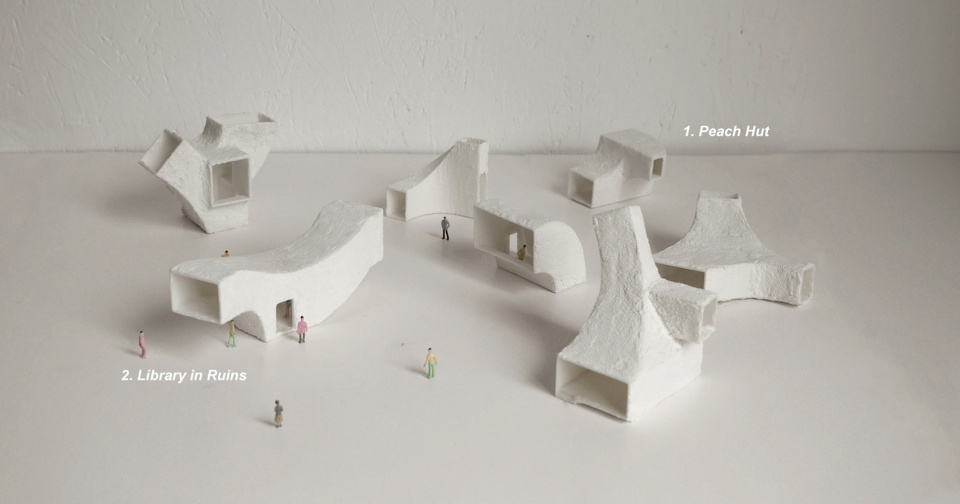 These cast-in-place concrete miniatures are interpreted into a series of tree-shaped spaces with tentacles reaching out for the sky, bathing in light and shadow. Their locations vary from fields, woods, to mountaintops, and their forms differ as well: while one grows out from the ruined walls in an abandoned village, another embodies a floating theater on the water. Following the first completed “Peach Hut”, the second episode of the miniature series, “Library in Ruins”, is constructed alongside the remnant of an adobe house in Sunyao Old Village which is 20 kilometers away from the Peach Hut.