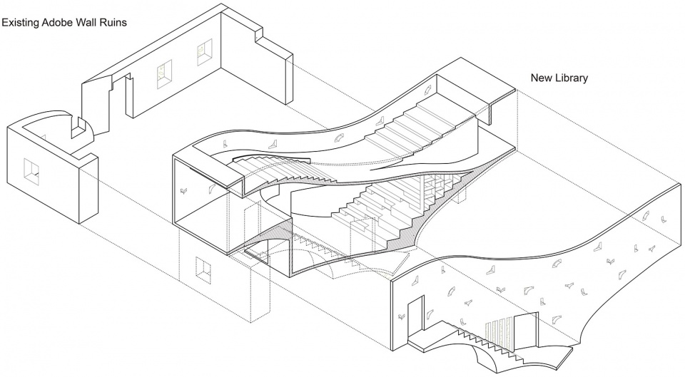 At first, the village asked the architect whether it was possible to build inside the plot of the original house where only a part of ruined adobe walls was left. However, after searching for nearby craftsmen, villagers were no longer able to find any craftsman who could build with the original rammed earth technique. Therefore, the architect proposed to build with a new method to allow a new structure to grow from the old ruins: allowing the new building to become a spatial device where people enter the ruins, jump over the old houses, and gaze into the village, the fields, and the mountains in the distance.