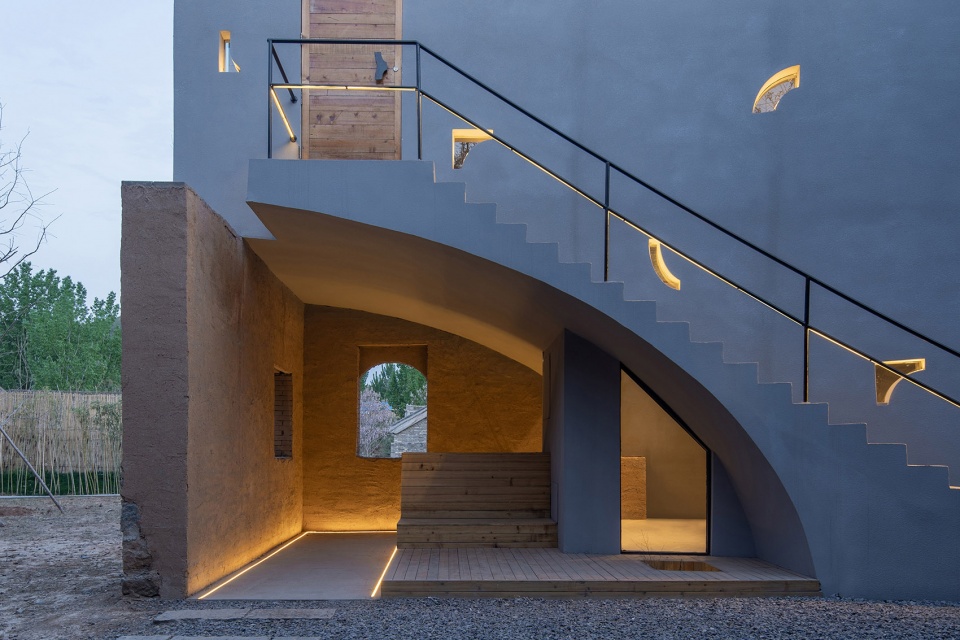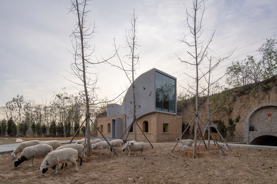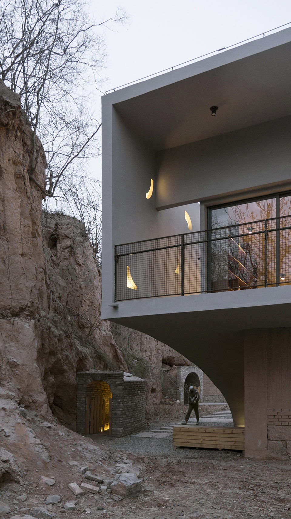 Furthermore, the architect hopes to present a duet of intertwined memories in this building: On the one hand, it connects cave dwellings, barren hills, and earth walls– physical remains with heavy texture and traces of time; On the other hand, it continues the formal languages of the miniature series while conforming to the context of the site to become a sculptural space that grows from the terrain. The two sets of memories spatially intersect each other: A concrete entrance protrudes out at the location of the original doorway on the remnant wall to invite people in; After entering the building, a corner of the remnant wall extends into the room, guiding people to explore the cave dwellings and the barren cliff in the rear garden; The traditional-style wooden doors are installed on the rear facade, continuously reminding visitors of the dialogues between the new space and the existing remnants.