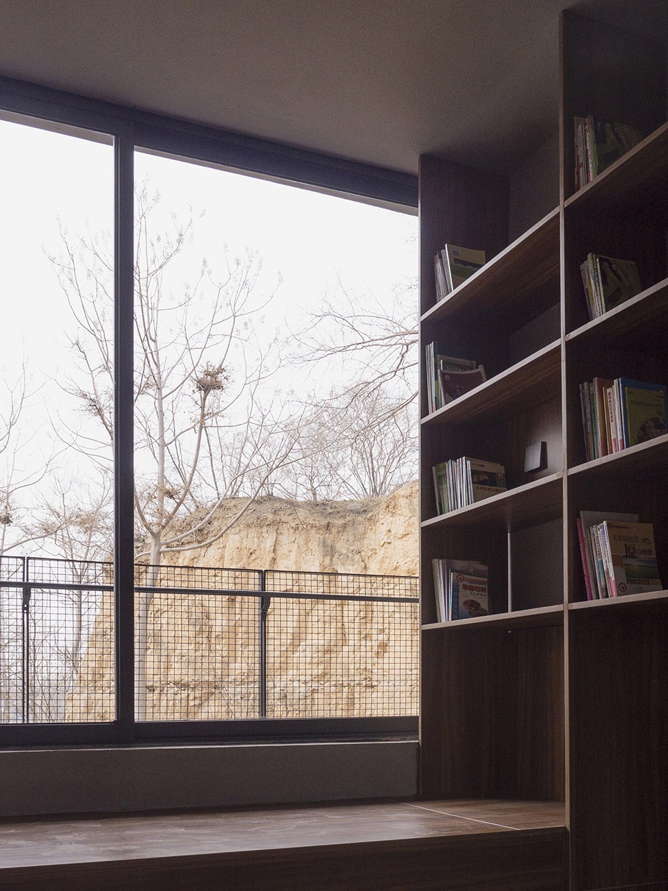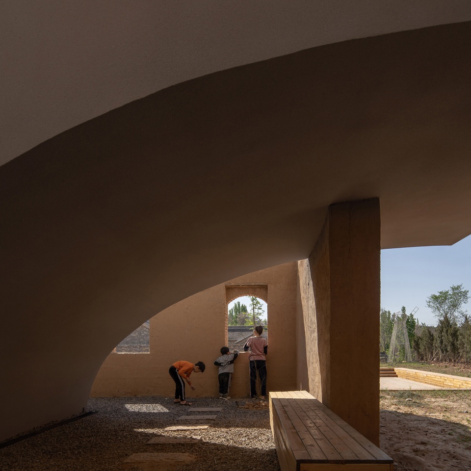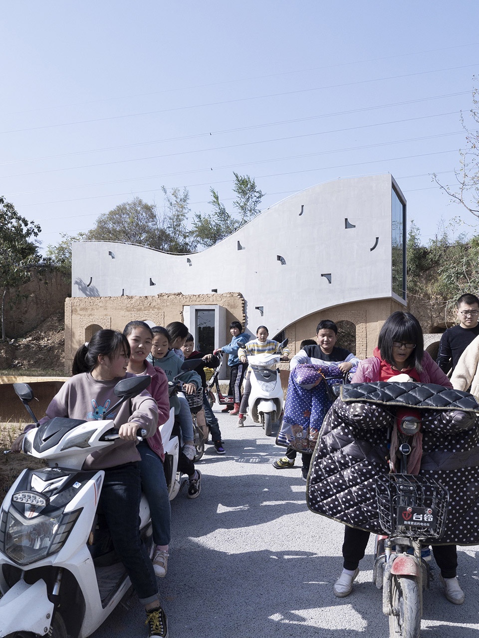 建筑的外形与内部空间以地形的状态展开。屋顶以起伏的轮廓呼应着地形与远山,而起伏地面在屋顶自然形成室外阶梯平台与滑滑梯。跃升过老屋的曲线剖面沟通起首层入口,二层阳台与屋顶平台。室内作为一个可以兼做小型论坛放映室的阶梯图书馆 。建筑蜿蜒的平面及周边路径则成为周遭迷宫般窑洞系统的延伸。