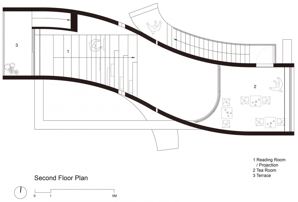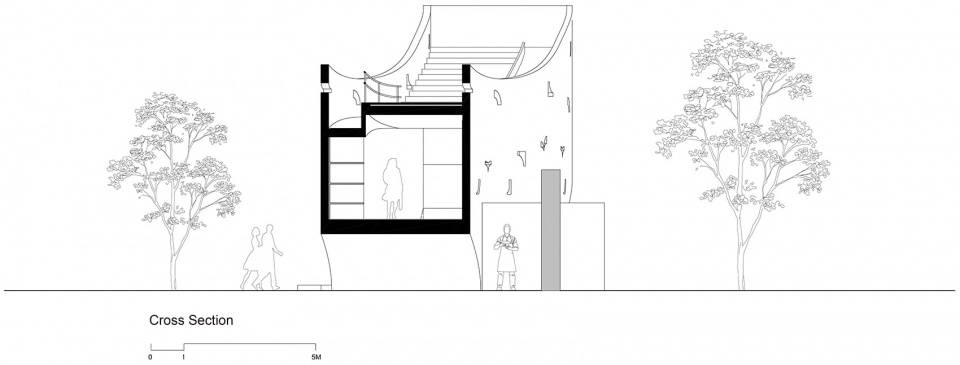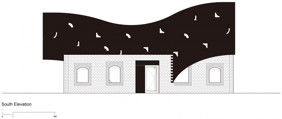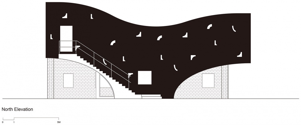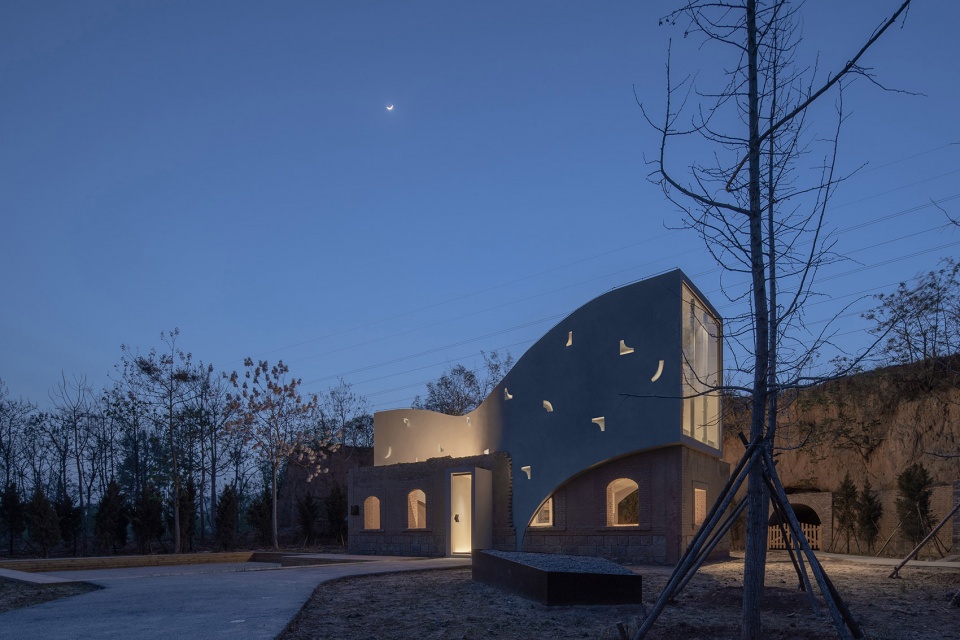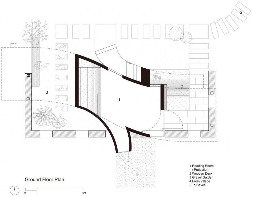 建筑的外形与内部空间以地形的状态展开。屋顶以起伏的轮廓呼应着地形与远山,而起伏地面在屋顶自然形成室外阶梯平台与滑滑梯。跃升过老屋的曲线剖面沟通起首层入口,二层阳台与屋顶平台。室内作为一个可以兼做小型论坛放映室的阶梯图书馆 。建筑蜿蜒的平面及周边路径则成为周遭迷宫般窑洞系统的延伸。