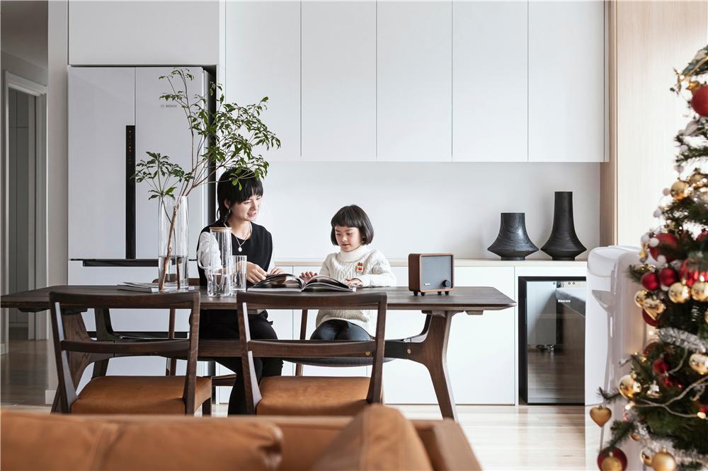 由此延伸出整体设计概念,既要分区明确、由需统一协调有着绝对的融合性。围绕着通透、明快的空间感受,我们将厨房做成了开放式。通透的空间布局使厨房与客餐厅连为一体,完成客厅、餐厅、厨房的细分功能合理性,制造空间的节奏感。同时将整体串联赋予空间足够的独立性和通透性,无阻隔的视野抬眼就能触及彼此。