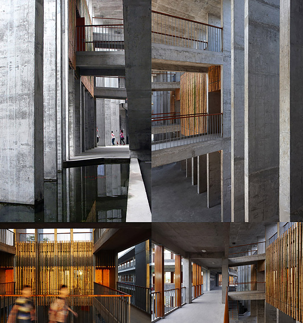 设计中针对当地气候,对遮阳、通风、隔热作了仔细的考虑;并且充分运用当地材料和工艺,如页岩青砖、木材、竹子等,还包括地震后回收的旧砖,使其参与到重建中获得再生的意义。 建筑结构采用现浇混凝土框架体系,外露的梁柱和部分混凝土墙面以清水方式处理,填充墙为外层清水砖墙和内层保温砌块的复合墙体,门窗采用实木门窗,固定扇为玻璃,开启扇为木头。上述元素在建筑立面上均清晰体现出其交接关系,反映出建构体系的逻辑。整个项目建筑工程造价在1500元/平米以下,很好地实现了整体预算控制。