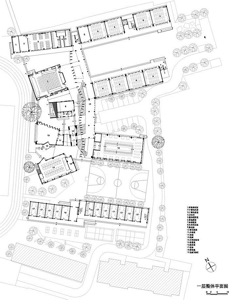 设计在满足校园基本教学功能的同时, 更多从儿童的视角出发,尝试通过创造多样的、有趣的、平等的建筑空间去鼓励小学生的交流和多元的行为模式,一定程度改良传统被动式的教育方式。设计将校园按照秩序、兴趣、释放三种行为分为三个区域,分别是普通分班教室、音乐美术等多功能教室群和室外运动场。给课内课外间的多种活动提供不同的场所。