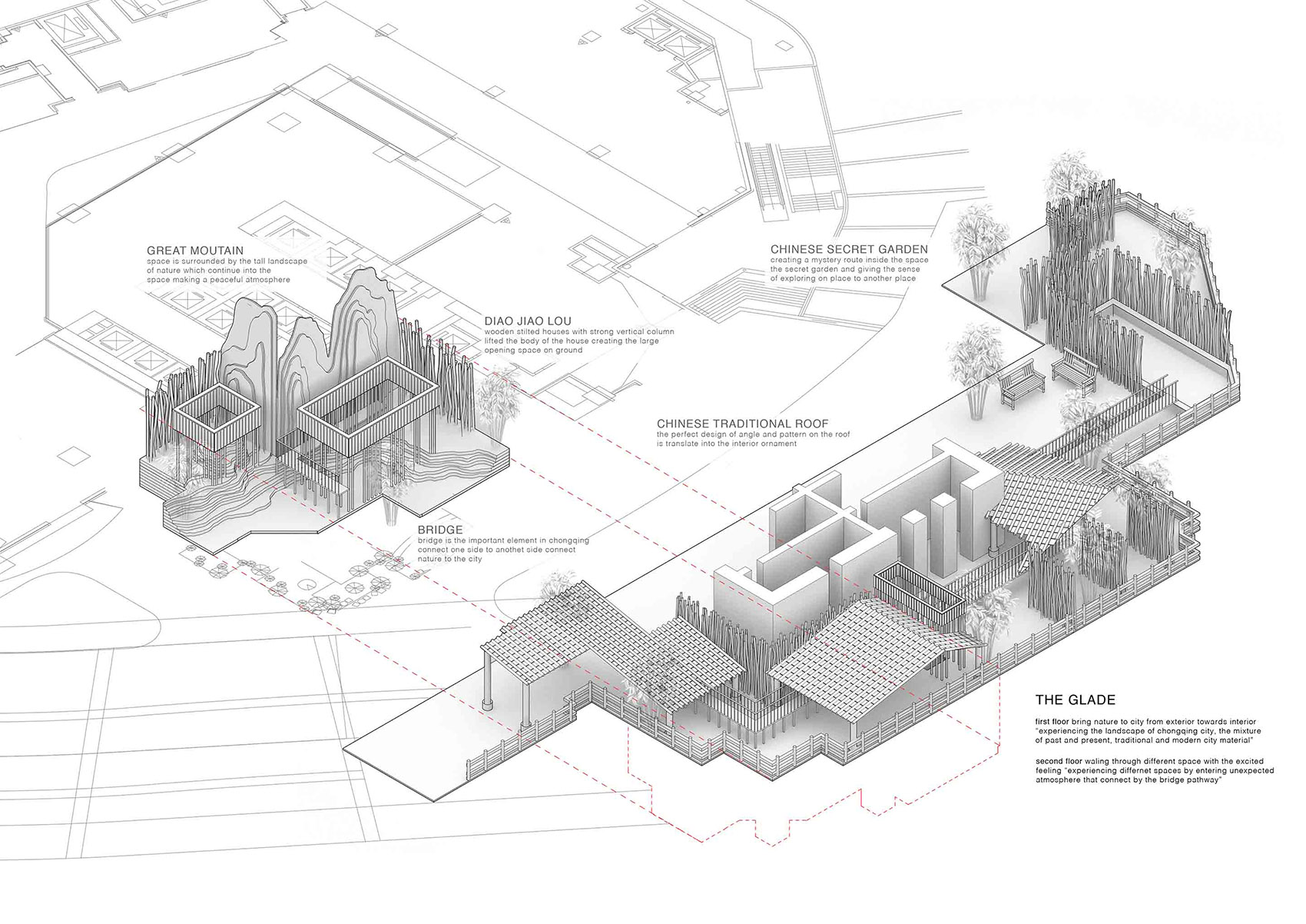 HAS(Hung And Songkittipakdee)开始想像,如果在市中心能感受到重庆原有的地形和传统吊脚楼,那将会是很有趣的感受; 因此,设计创造不同高度的多层屋顶,试图重塑重庆那优美的地形与吊脚楼形式。