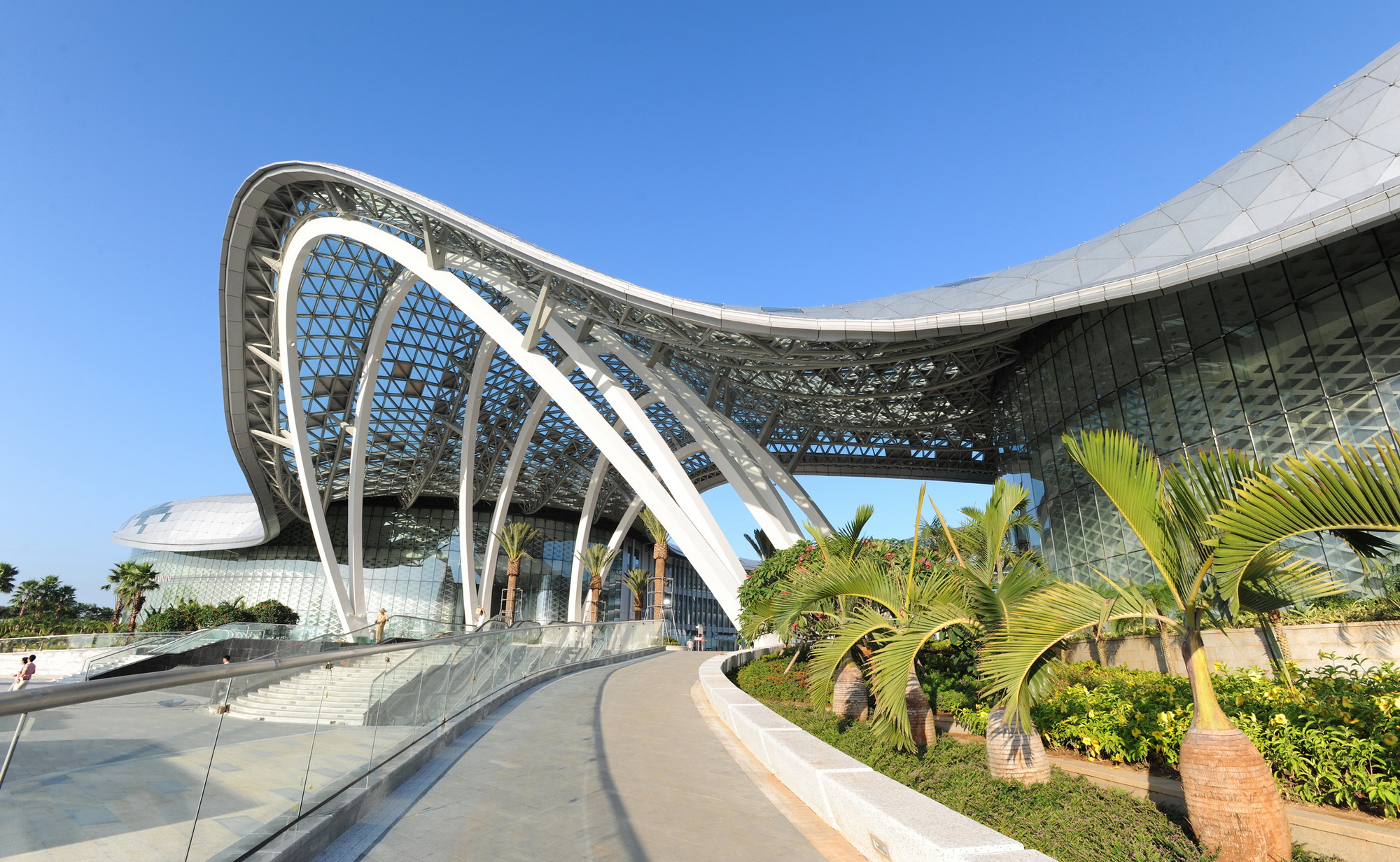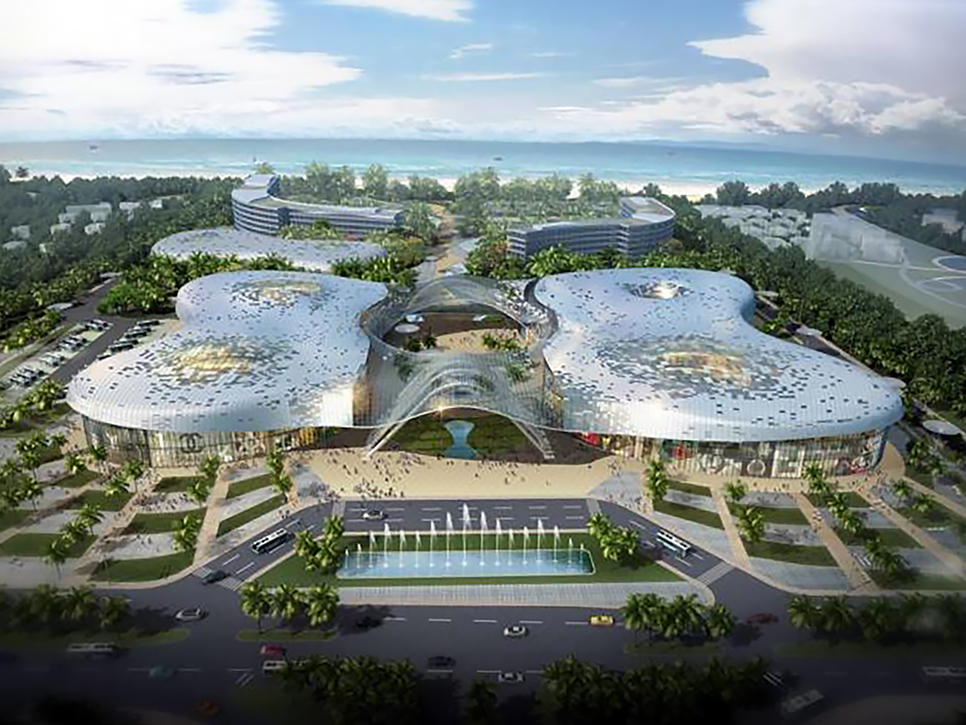 CITS Haitang Bay International Shopping Center is located at the north end of the prime section of Haitang Bay in Sanya, 32 kilometers away from Sanya Phoenix Airport, and connected with Yalong Bay and Lingshui Bay. The planning includes shopping centers, hotels and villas. The project started in 2011 and is expected to be delivered in August 2014. The creative inspiration of the whole business center comes from the begonia flower, which symbolizes Sanya. The two buildings serve as duty-free shopping malls, with a 50-meter public axis in the middle passing through the site from the north, and a public street connected to the seaside in the south. The two buildings are surrounded by a sunken central courtyard, which is decorated with waterscape and green plants and can be used for exhibition. The unique free metal roof outlines the lightweight streamline of the building, and also provides a good comfortable shading environment for shoppers. Especially, the main entrance roof has a span of 50 meters and a height of 35 meters, which highlights the project's iconic characteristics. French VP Architectural Design Office undertakes the work of schematic design and preliminary design of architectural discipline in this project.