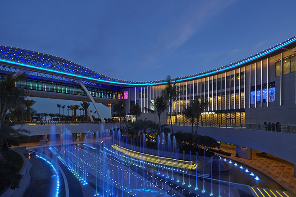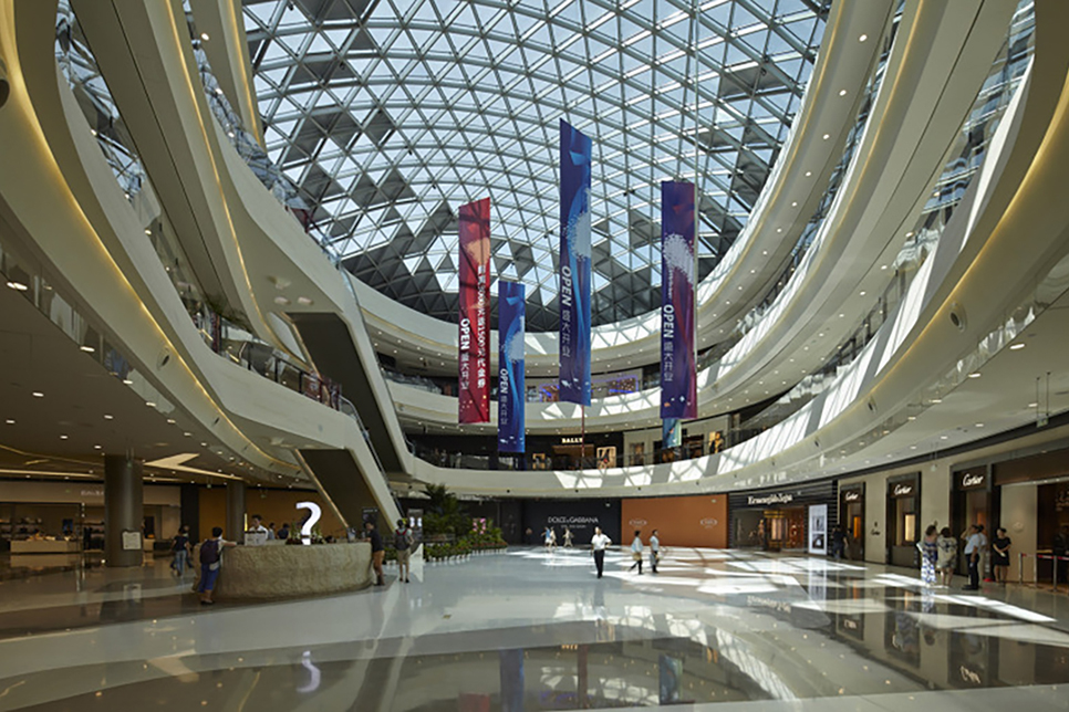 整个项目分两期建设,一期为购物中心、二期为酒店及别墅,总投资额达到50亿元。项目总占地面积约19万 m²,购物中心总建筑面积约123 098 m²,包括地上3层,约66 589 m²;地下1层,约56 508 m²,是全球最大的单体免税商城之一。