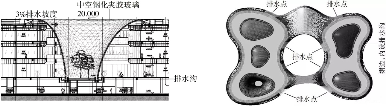本工程屋面为起伏较大的空间屋面,屋面自身形成的排水坡度较大(采光顶边部最小排水坡度设定为3%),且周边相对较低,水在重力作用下往屋面周边排,在周边设置裙边,裙边内设置排水沟,将屋面汇水排出;漏斗采光顶的底部同样设置排水沟,将漏斗采光顶汇水排出。具体操作时,为了保证屋面汇水以最快的速度排出,还需按“距离最短、最有效、最清晰”的原则对屋面进行排水区域划分。