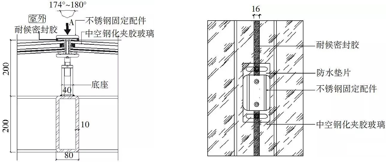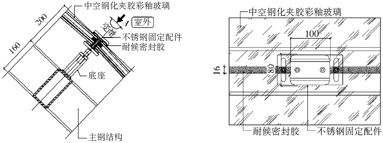 本项目采光顶的防水密封设计主要是玻璃板块间的接缝密封,选用的材料为具有25级位移能力的硅酮耐候密封胶,接缝宽度为16 mm,选材原则是:保证密封胶处于拉伸或压缩状态时,仍能保持粘结性不受破坏,并具有较好的弹性回复率。