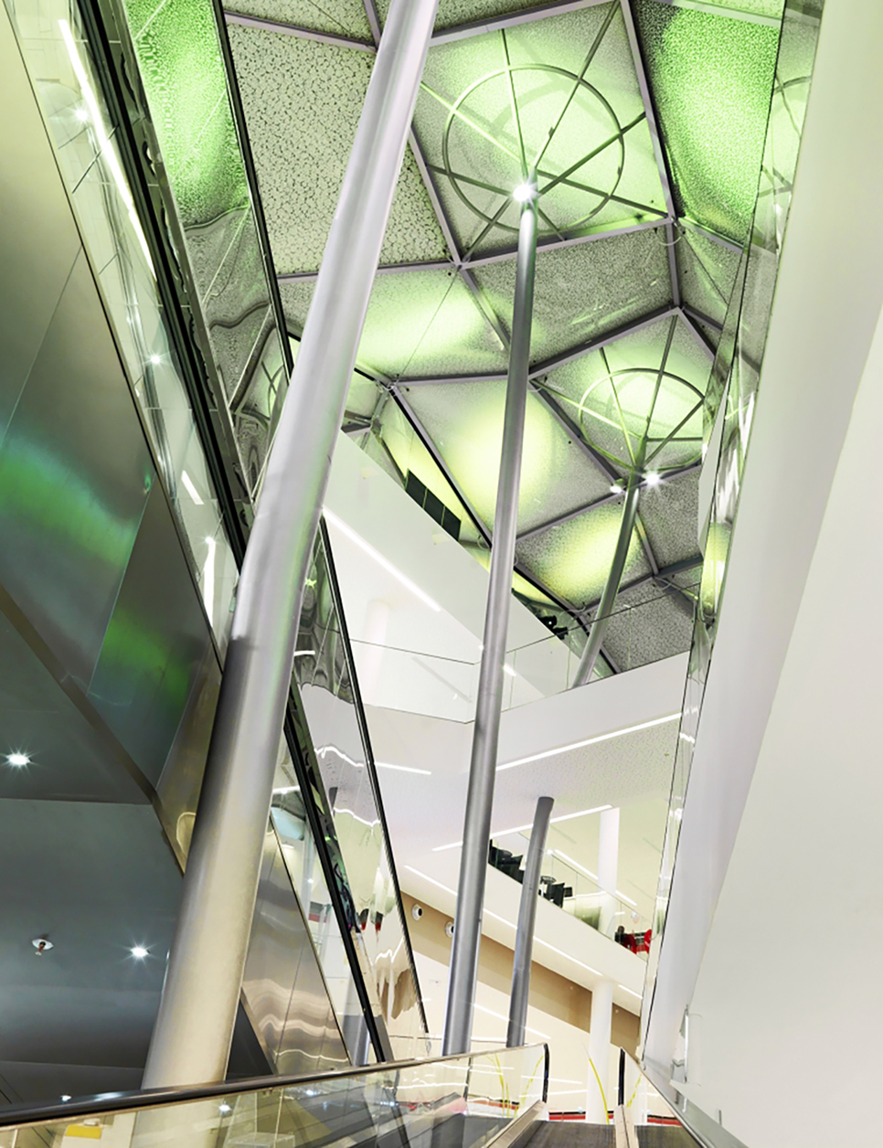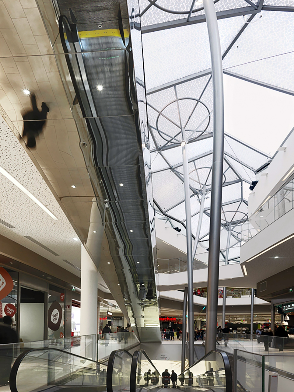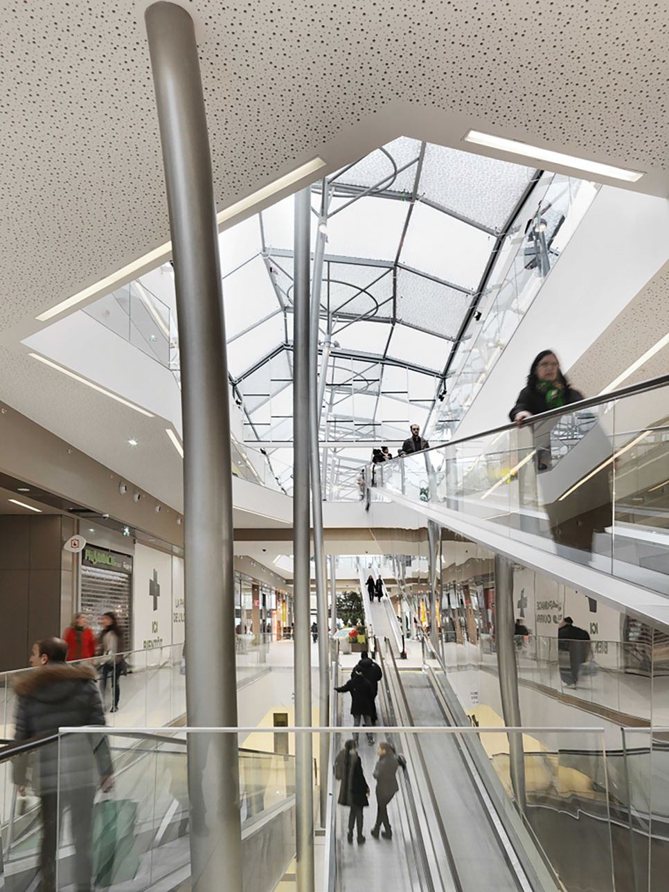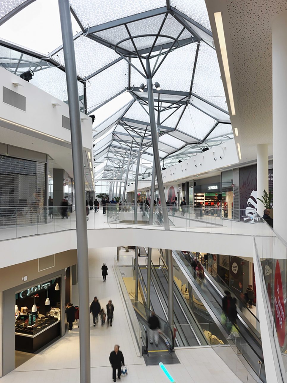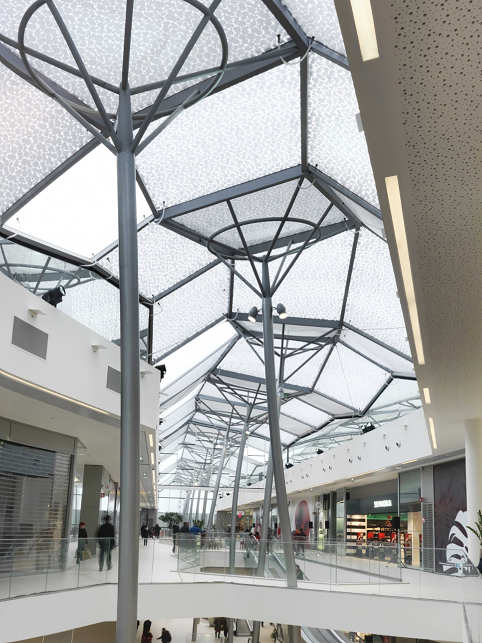 这一新项目将购物中心分为三个极易识别的城市岛状区,由两条穿过中央广场的开放式街道相连接,街道上方覆盖着以森林树木为寓意的顶棚,树状的钢柱从地面延伸至顶棚,以不规则的倾斜来诠释自然界中树木的形状,从天空俯瞰尤如两条相接的林荫路,至身其中,购物的同时,也能欣赏沿途的风景,独特的设计给人以感观上的乐趣,也成为了项目的标志,是环保概念与商业中心的有机结合。