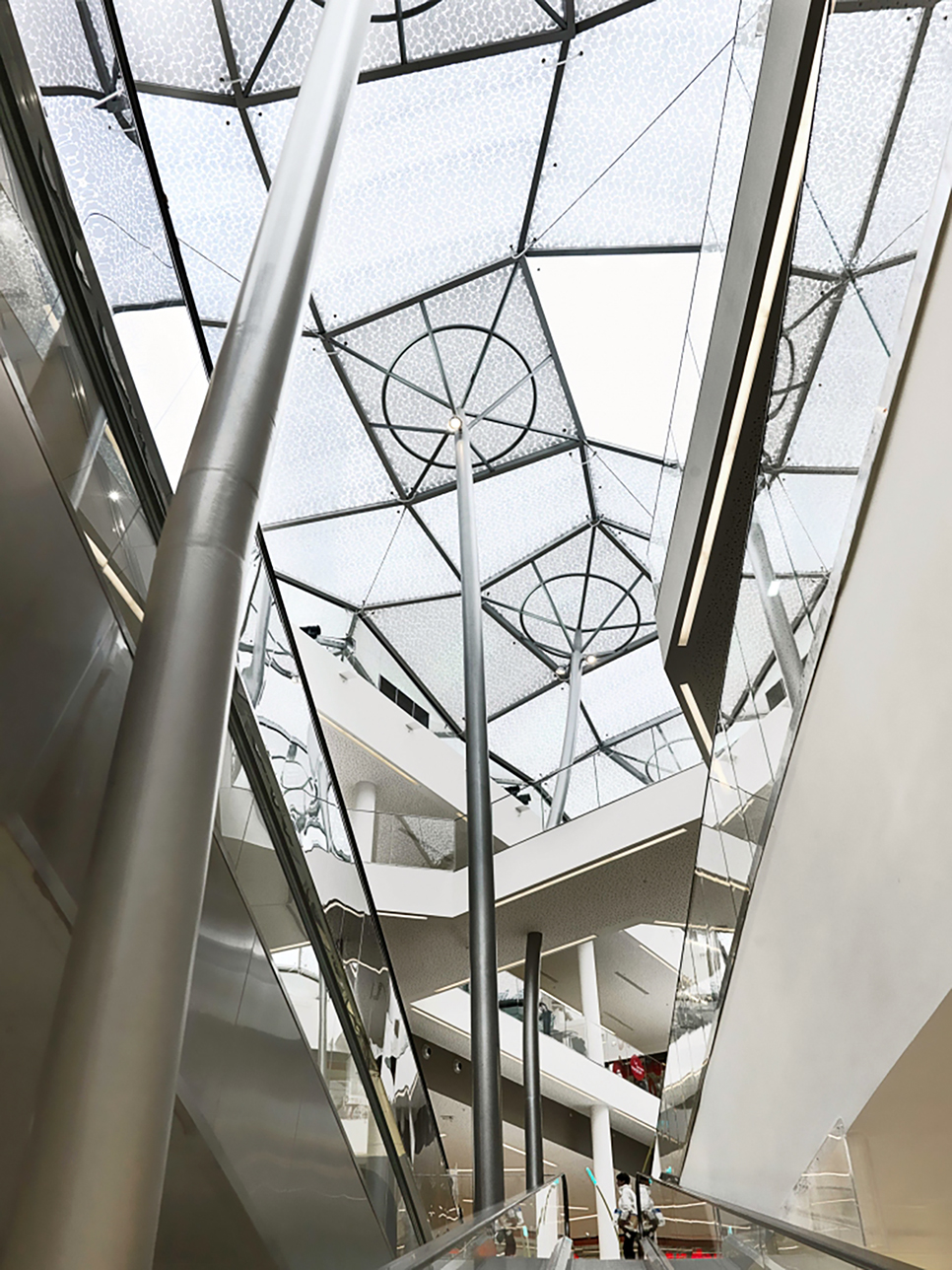 This new project divides the shopping center into three easily recognizable urban island areas, which are connected by two open streets passing through the central square. Above the street is covered with a canopy with the meaning of forest trees. The tree-shaped steel columns extend from the ground to the ceiling, interpreting the shape of trees in the nature with irregular tilt. Looking down from the sky, it is like two adjacent tree-lined roads. When you are in it, you can also enjoy the scenery along the way while shopping, The unique design gives people a sense of pleasure and has become the symbol of the project. It is the organic combination of environmental protection concept and business center.