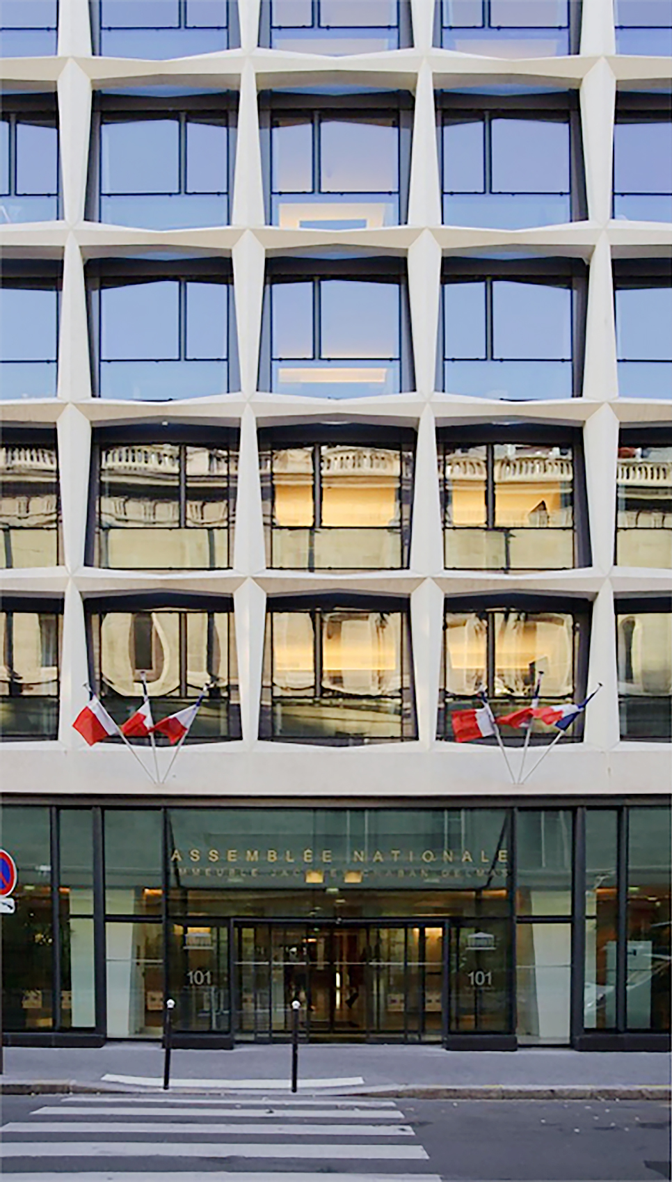 The center of the French National Assembly, located in the 7th district of Paris, is composed of the building "JACQUES CHABAN – DELMAS" at 101 University Road and the building at 32 St. Dominique Road.