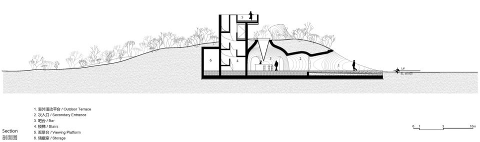 Countless years of wind have pushed the sand into a strip of dune along the shore a few meters high, stabilized by the low rising shrubs and ground covers. Inspired by kids’ tireless digging in the sand, this art space is carved in the dunes. “Digging” creates a series of connected soft spaces, much like caves, the primal form of human inhabitance and the earliest site of man’s artistic creation. Between the sea and the sand, a hidden place emerges, intimate to the body and soul. It allows those who enter it to re-experience the long-lost childhood memory of putting a shell to the ear. Listening to the chimes of the sea in the temple of the spirit lets our bodies return to their original shelters.