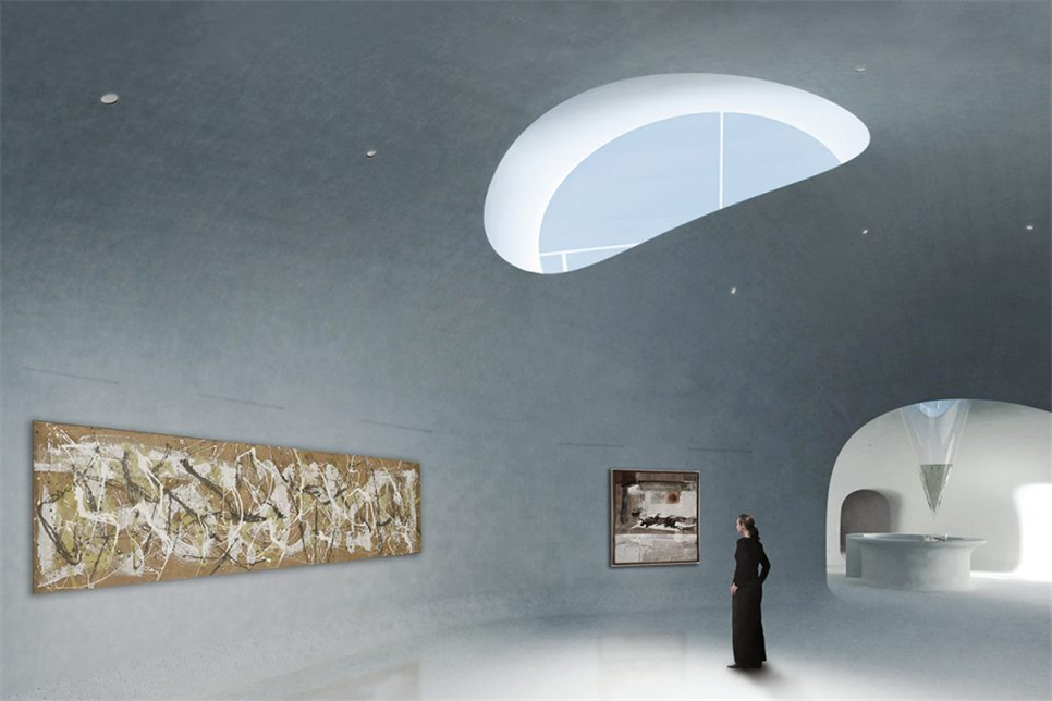 The sea is constantly changing through different openings and at different moments. The light cannon sculpted by the path of the sun beams soft refracted daylight into the center of the space. Dancing around the curving surfaces in tiny steps, diffused light endows the place with a bright and uplifting spirit to produce a multi-functional gallery space. A giant sandglass lets time and natural light flow softly into the space.