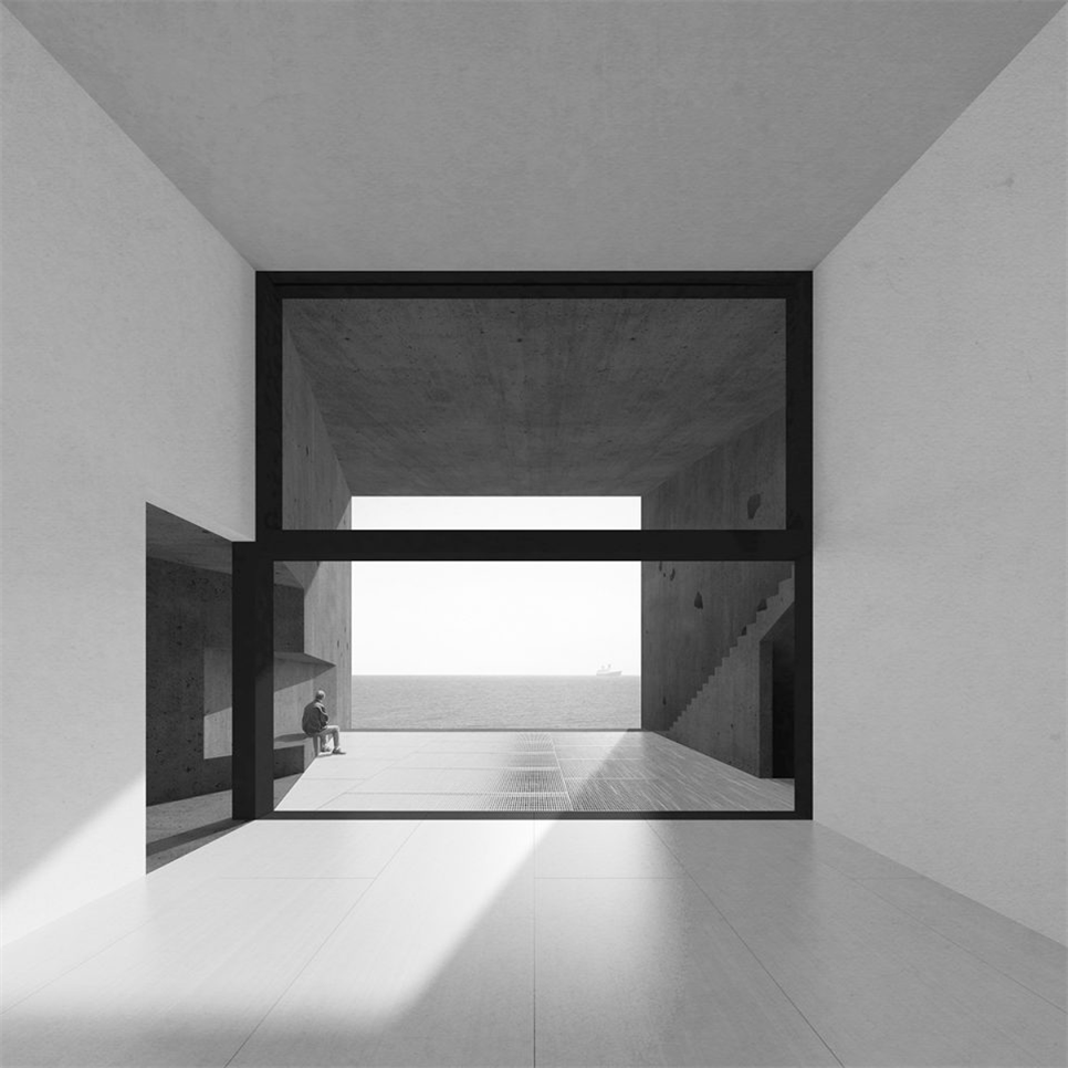 “礁石”倾斜地冒出海面,吸引参观者向不同高度攀爬或者停留。面朝大海,展示空间开放透明,从室内延续到室外,继续向天空和海底伸展,倾听着自然的呼吸。类似“码头”的半室外空间也是接纳艺术品和乘船而来的参观者的地方。
