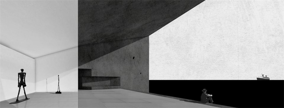 “礁石”的几何形态由两条线构成:一条垂直于海岸,一条垂直于正北,两线夹角15度。艺术空间的立面与平面形状一致。几何与秩序,沉静与坚决的力量。这是一个面向大海的展览空间,同时拥有一个闭关创作的艺术家工作室。连接“礁石”与海岸的栈道,是一条朝圣艺术之路。圣圣艺术之路在一定的时间和适合的潮汐下才能显露出来,如同自我发现的历程——有时可望而不可即。