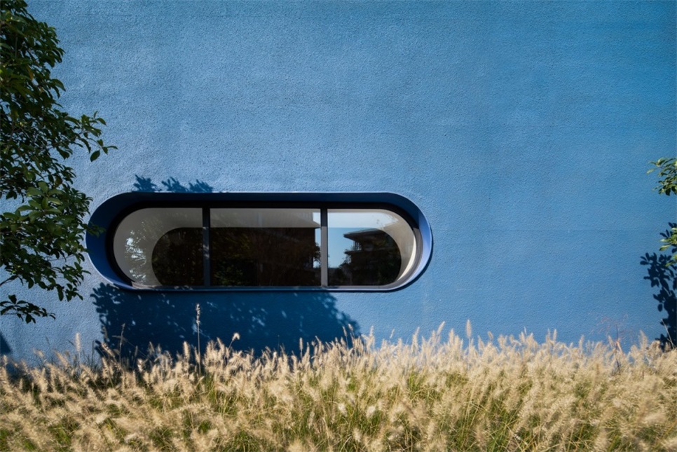 图书剧场位于聚落校园重要的一角,靠近一条城市主干道和一条古运河的交汇处,从远处就可以看到它醒目的蓝色和倾斜的屋顶。一个个有机形态的天窗、舷窗和圆洞,组合成生动的表情,将这个K12学校的天真与童趣引入城市界面。
