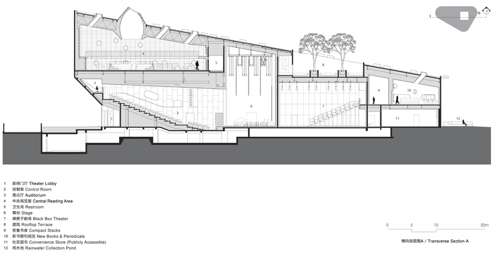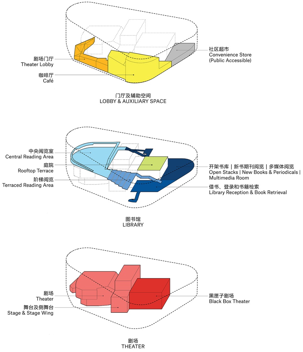 专业剧场和黑盒子剧场需要最少的自然光和最好的隔音效果,于是它们被放置在了建筑的下半部分和中心区域。图书馆则占据了建筑的上半部分。OPEN充分利用了剧场观众厅与台塔之间的高差,将图书馆的各个空间楔入其中,并将不同高度的空间用阶梯阅览室串联起来,组成环状的空间序列,这一序列在一个沉浸在光与书包围中的圆形阅览室达到顶峰。
