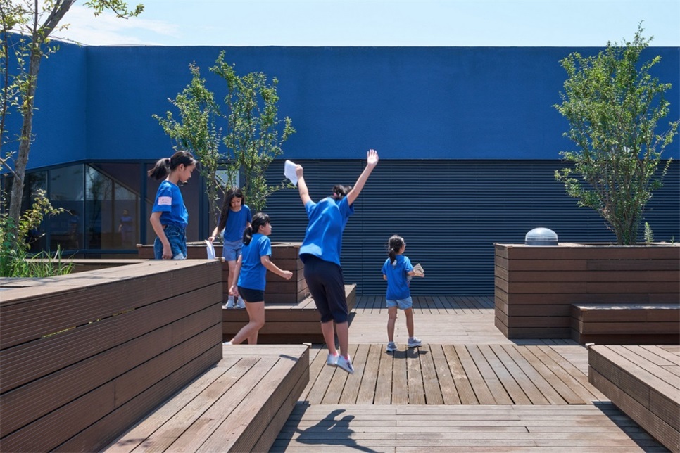 另一方面,舞台表演的体验则是外向且兴奋的。因此空间也做了更加戏剧化的处理——剧场的主入口是直接斜切建筑而形成的夸张开口;剧场中的暖色木板和深蓝墙面形成了强烈的视觉冲击;首层的咖啡厅还为家长们提供了阅读和交流的空间。